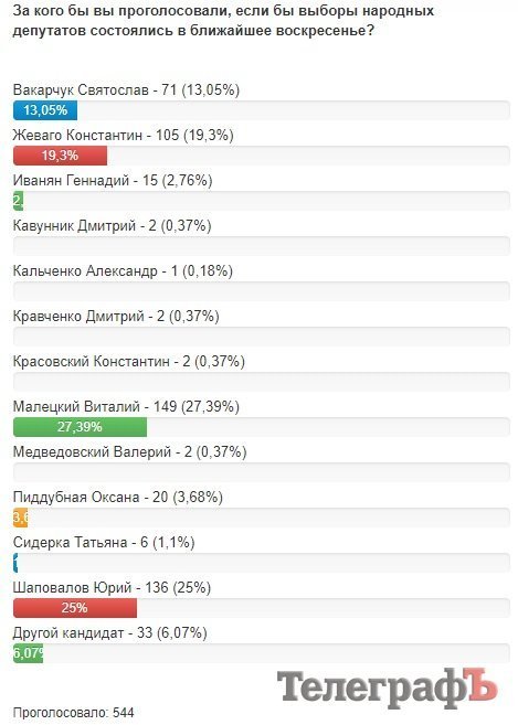 Проголосовало 544 человека. Ситуация резко меняется. Вакарчук уходит с лидерских позиций. В игру включается кандидат Жеваго. Он с нуля набирает 19,3% (105 голосов). Но отстает от лидера – им становится Малецкий, у него 27,39%. Вторым идет Шаповалов – 25% (136).