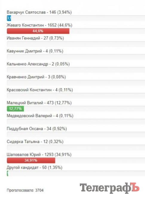 В 18 часов мы закрыли голосование. Лидировал Жеваго, у него было 44,6%, это 1652 голоса. Малецкий резко ушел на третье место (12,77%), а на второе вырвался Шаповалов с 34,91%.