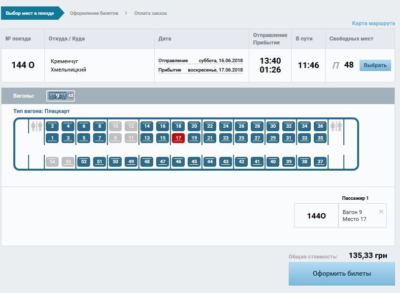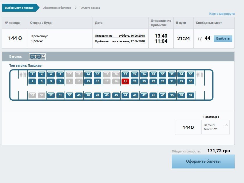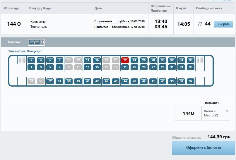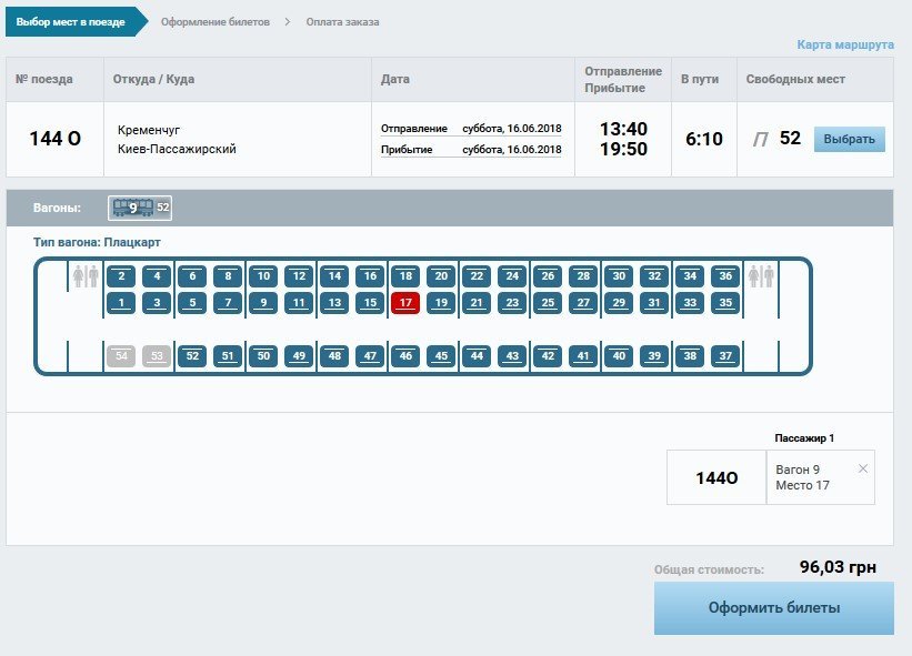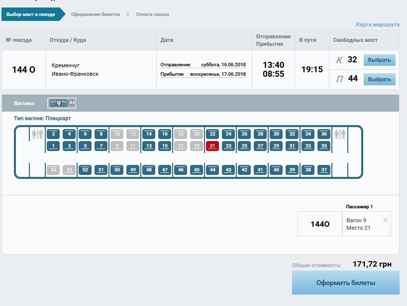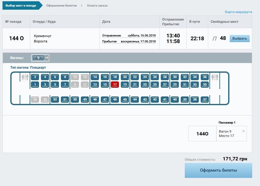 Уже відкритий продаж квитків на сайті «Укрзалізниці». Плацкартний квиток з Кременчука до Ворохти обійдеться кременчужанам у 172 гривні.
