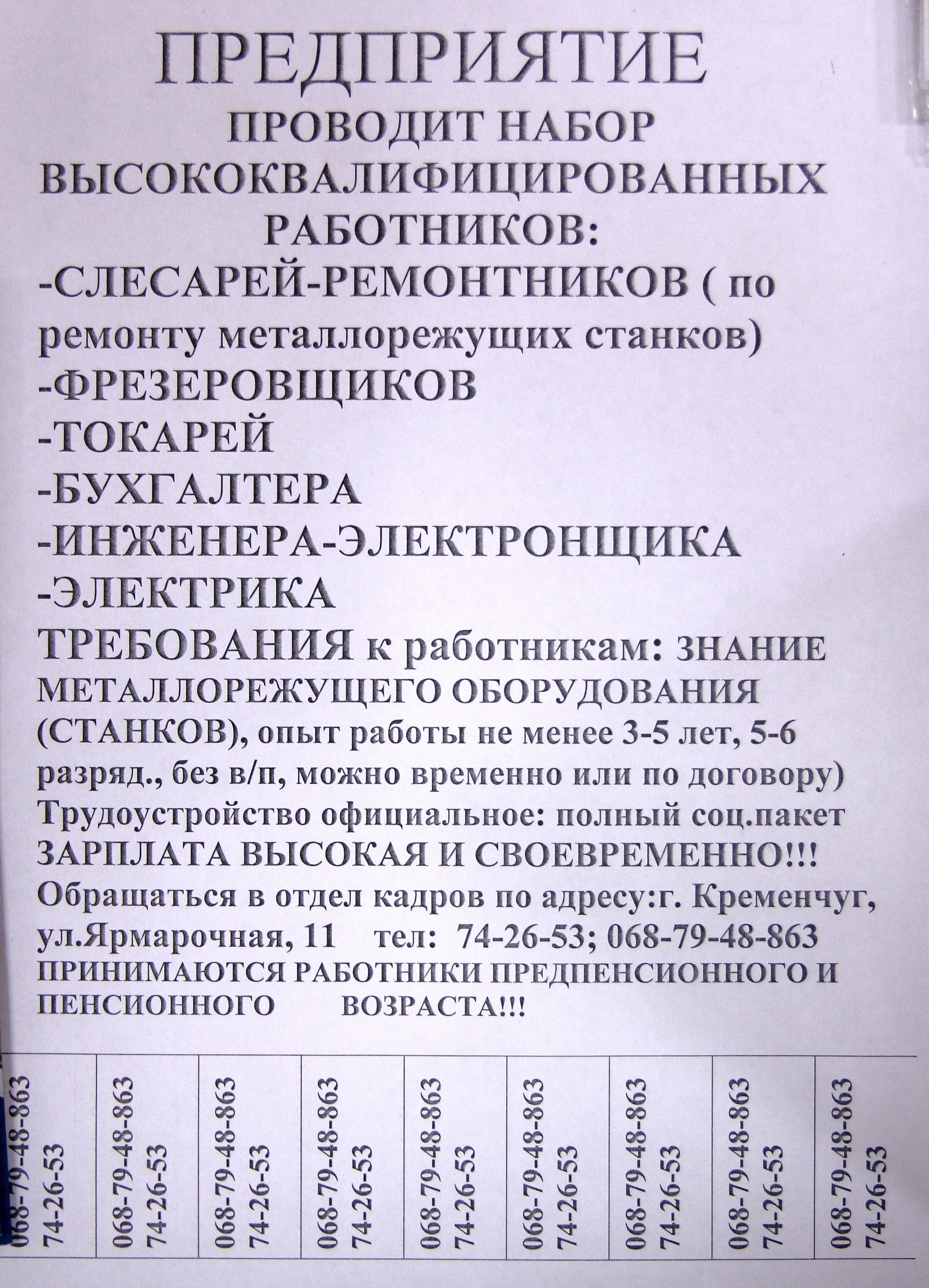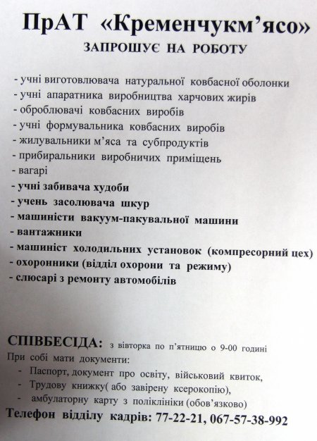 Багато відкритих вакансій на ПрАТ «Кременчукм'ясо»: оброблювачі ковбасних виробів, жилувальники м'яса, прибиральники, вагарі, машиністи пакувальної машини, машиністи холодильних установок, охоронці, слюсарі з ремонту автомобілів та учні.