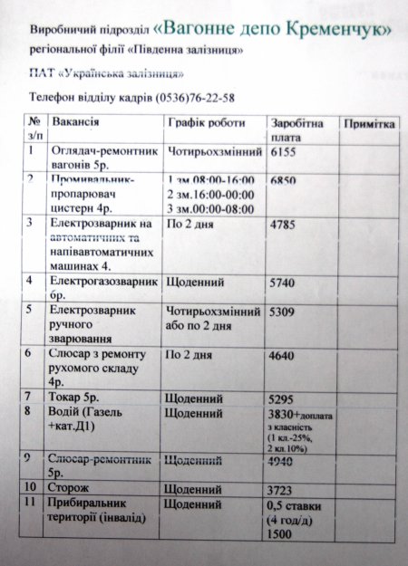 Скромніші розцінки у «Вагонному депо Кременчук» - 1500 гривень прибиральнику, до 6 850 пропарювачу цистерн.