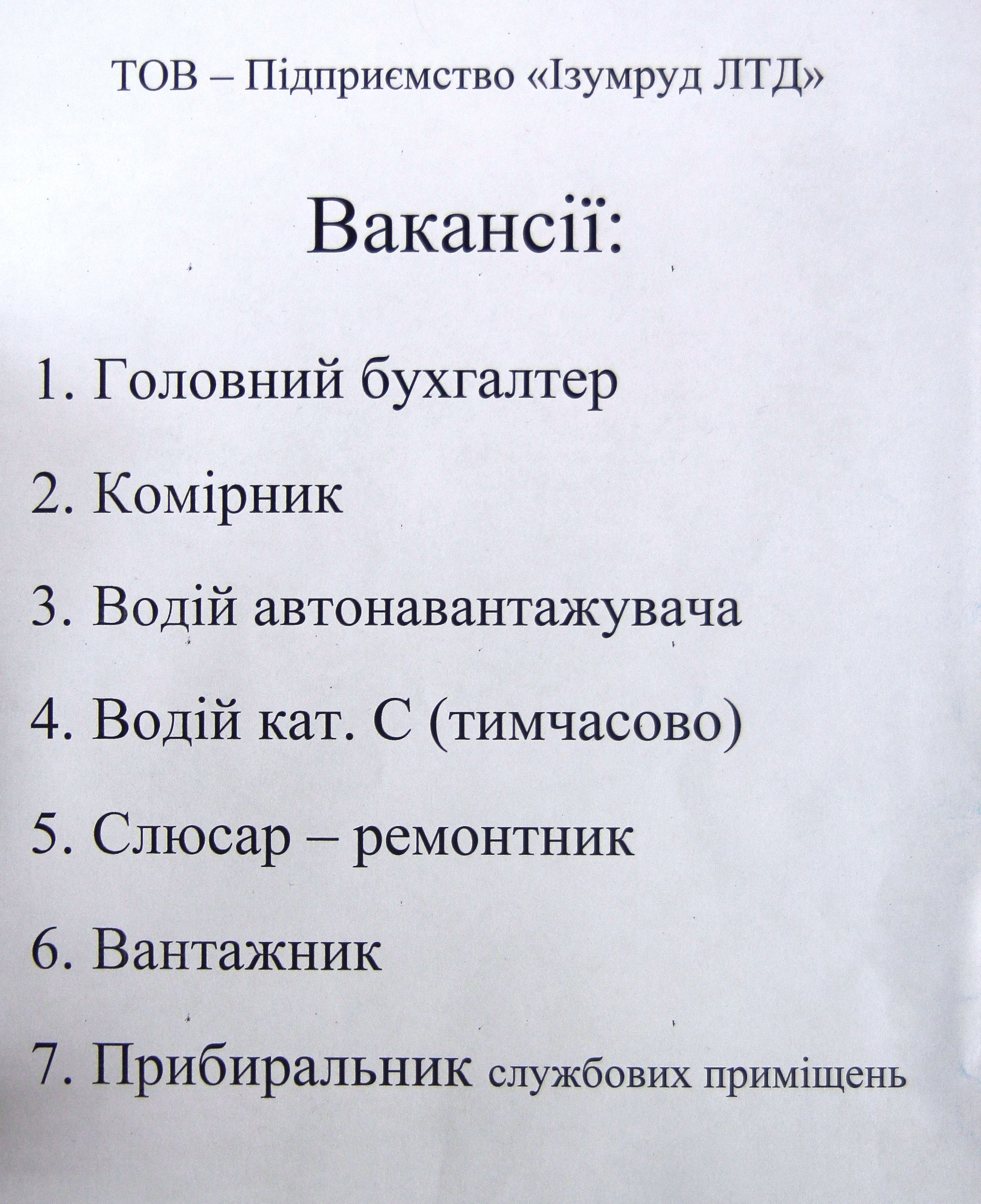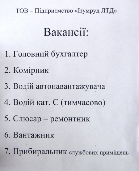 Головного бухгалтера, комірника, водія автонавантажувача, водія С, слюсаря-ремонтника, вантажника та прибиральника чекають на «Ізумруді».