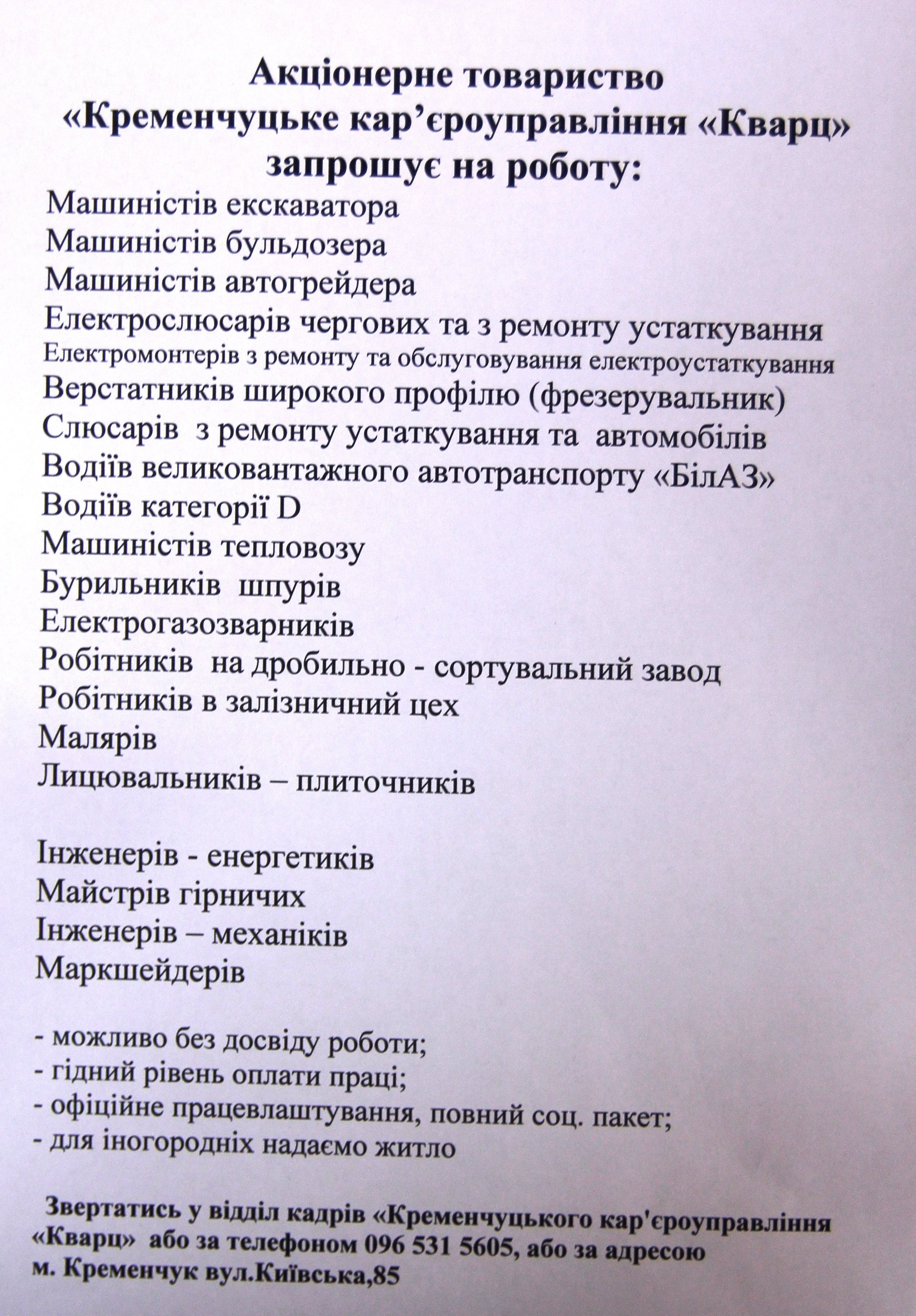 20 вакансій відкрито на «Кварці»: машиністи, електрослюсарі, електромонтери, верстатники, слюсарі, водії, машиністи, електрогазозварювальники, бурильники, малярі, плиточники, інженери, майсти-гірничні, маркшейдери.