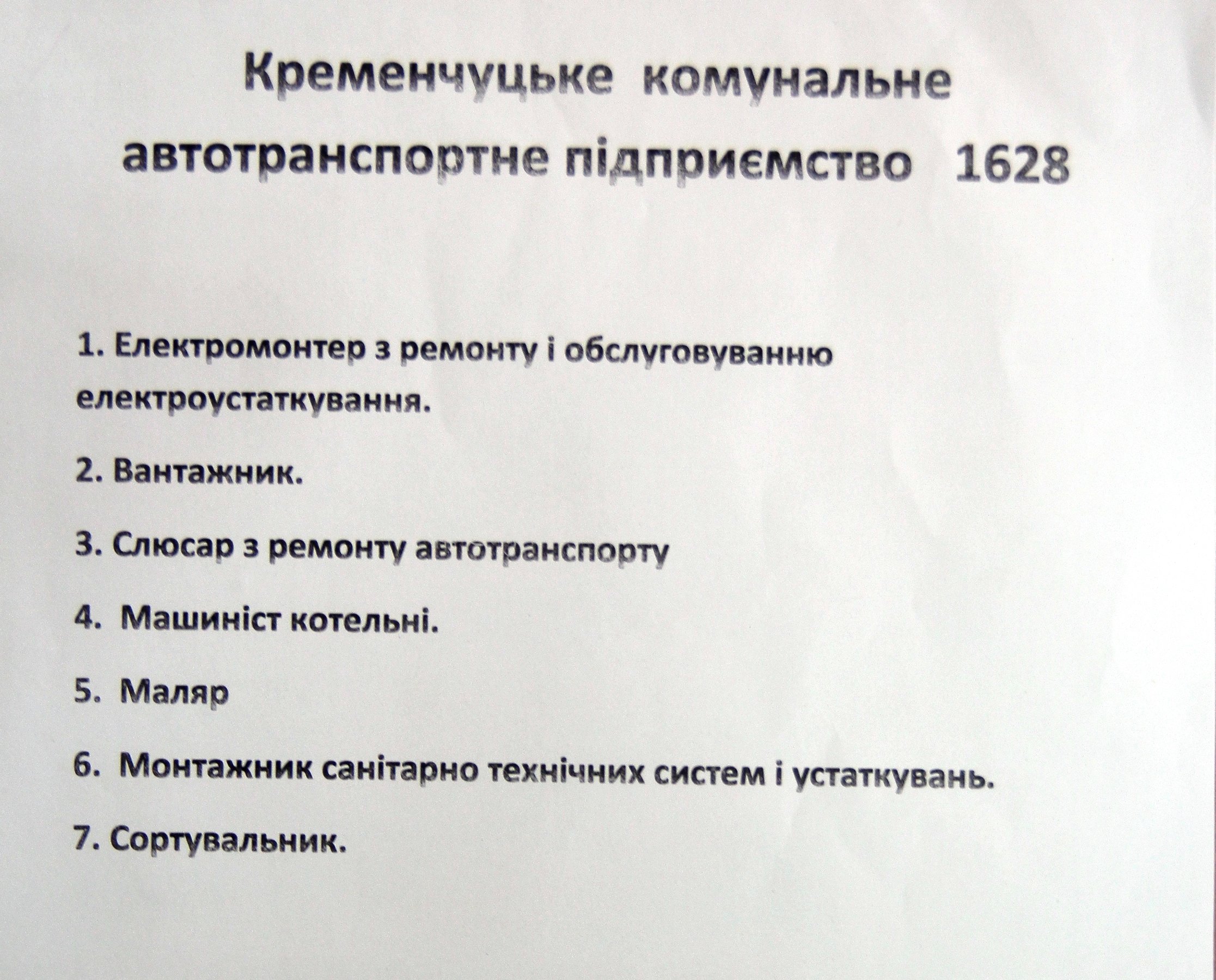 КАТП 1628 запрошує на роботу електромонтера, вантажника, слюсаря, машиніста котельні, маляра, монтажника сантехсистем та сортувальника.