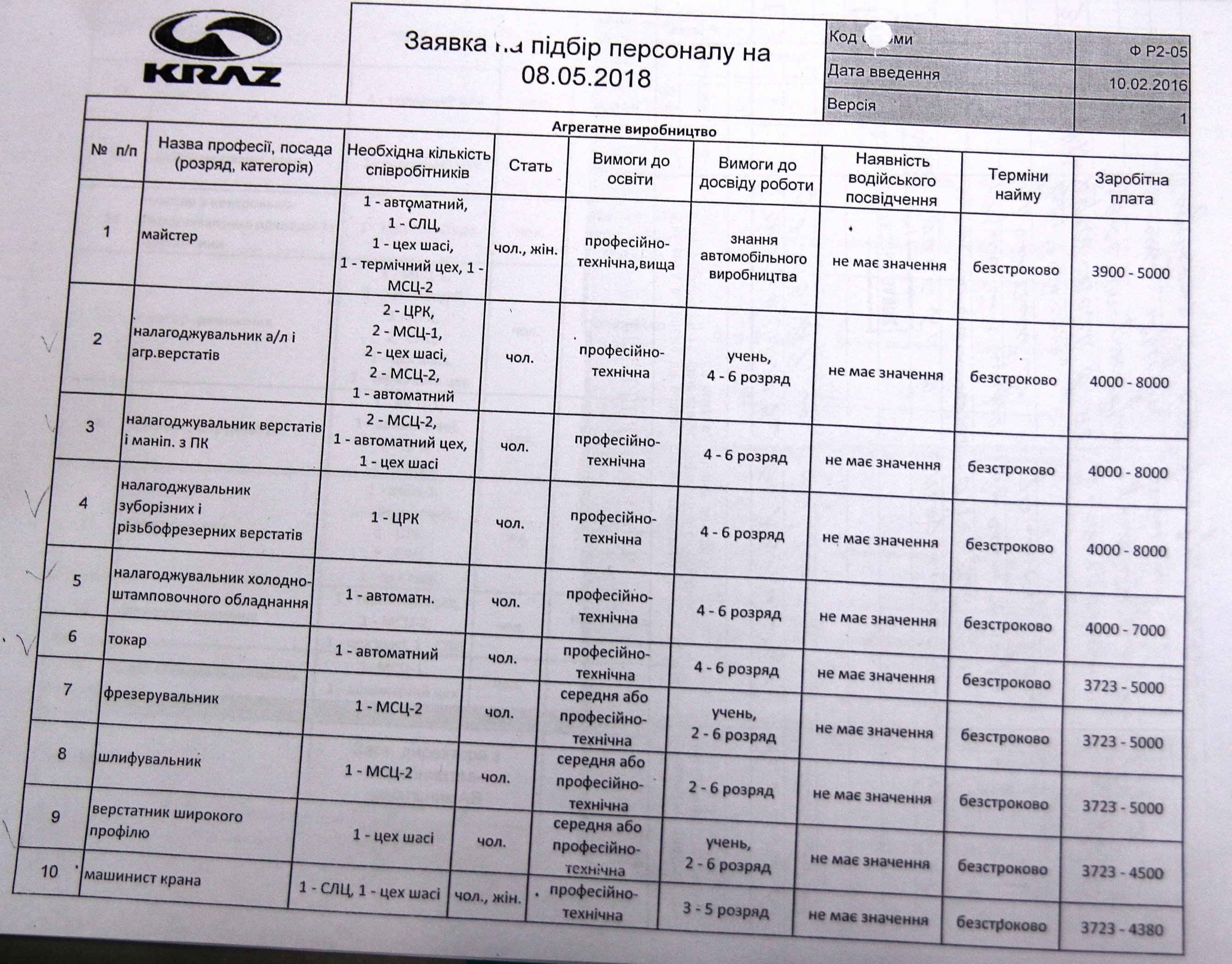 КрАЗ пропонує зарплату від 4000 до 8000 гривень. Шукають: майстрів, налагоджувальників, токарів, фрезирувальників, шліфувальників, верстатників, машиністів крану.