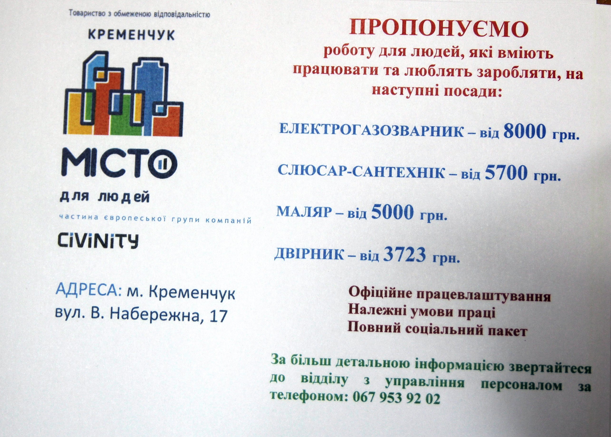 Потребує працівників і управляюча компанія «Місто для людей. Кременчук». Елекрогазозварювальника кличуть на 8 000 гривень, а двірників – на 3 723 гривень.
