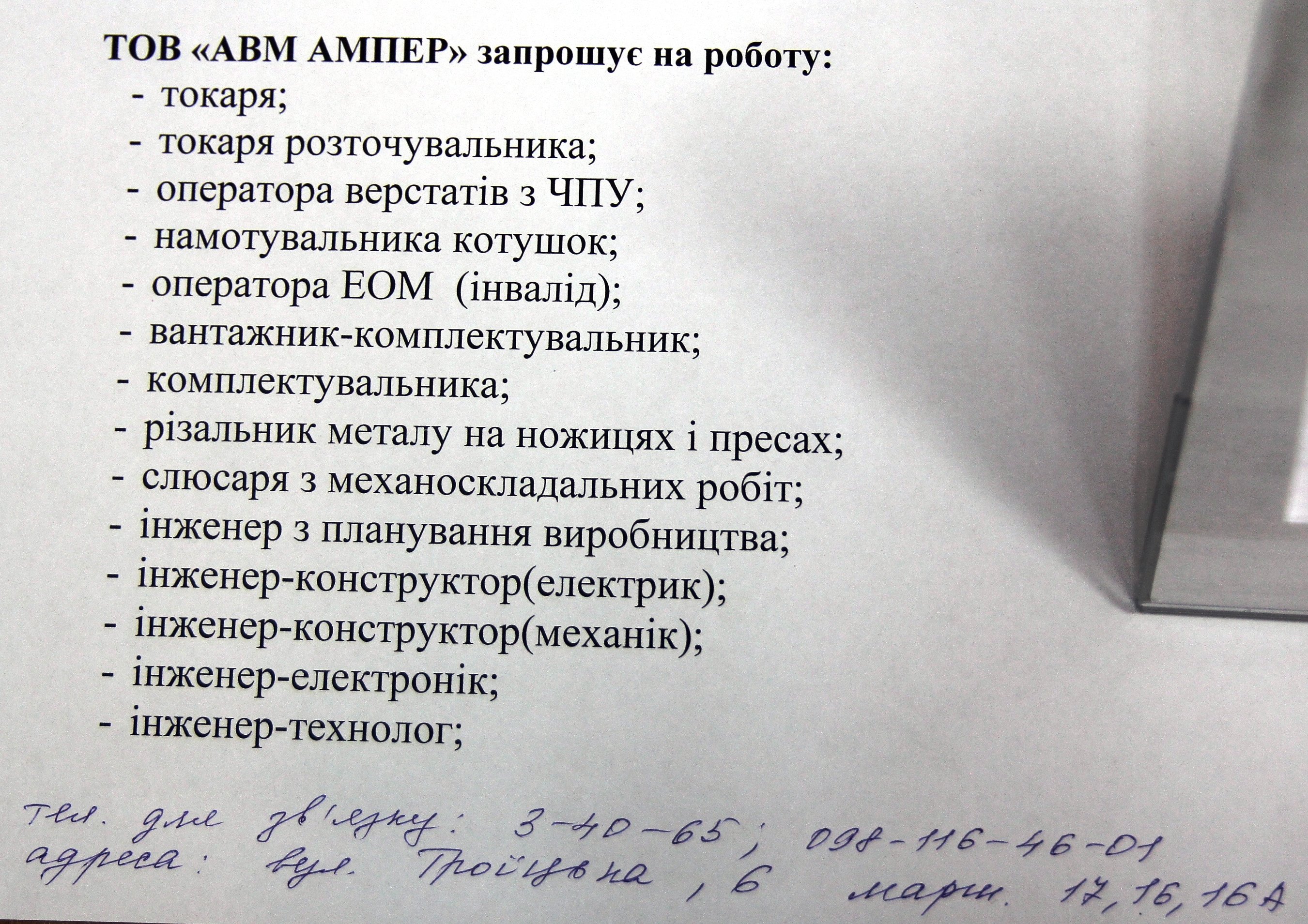 Інженери потрібні на «Ампері», а крім них ще: токарі,оператори верстатів, оператори ЕОМ, намотувальники котушок, вантажники, комплектувальники, різальники по металу і слюсарі.