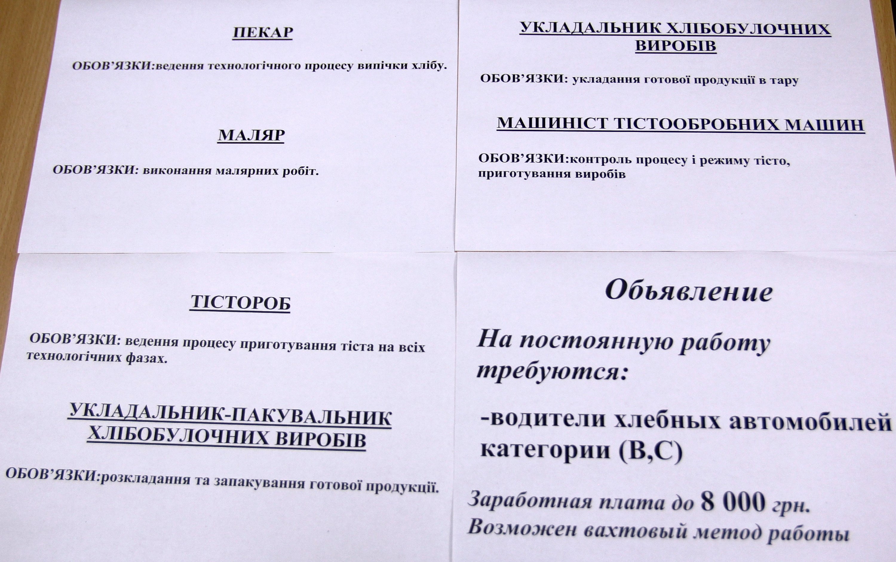 На хлібокомбінат на зарплату ДО 8 000 гривень запрошують: пекарів, тісторобів, укладальників хлібобулочних виробів, машиністів тісторобних машин, малярів та водіїв хлібовозів.