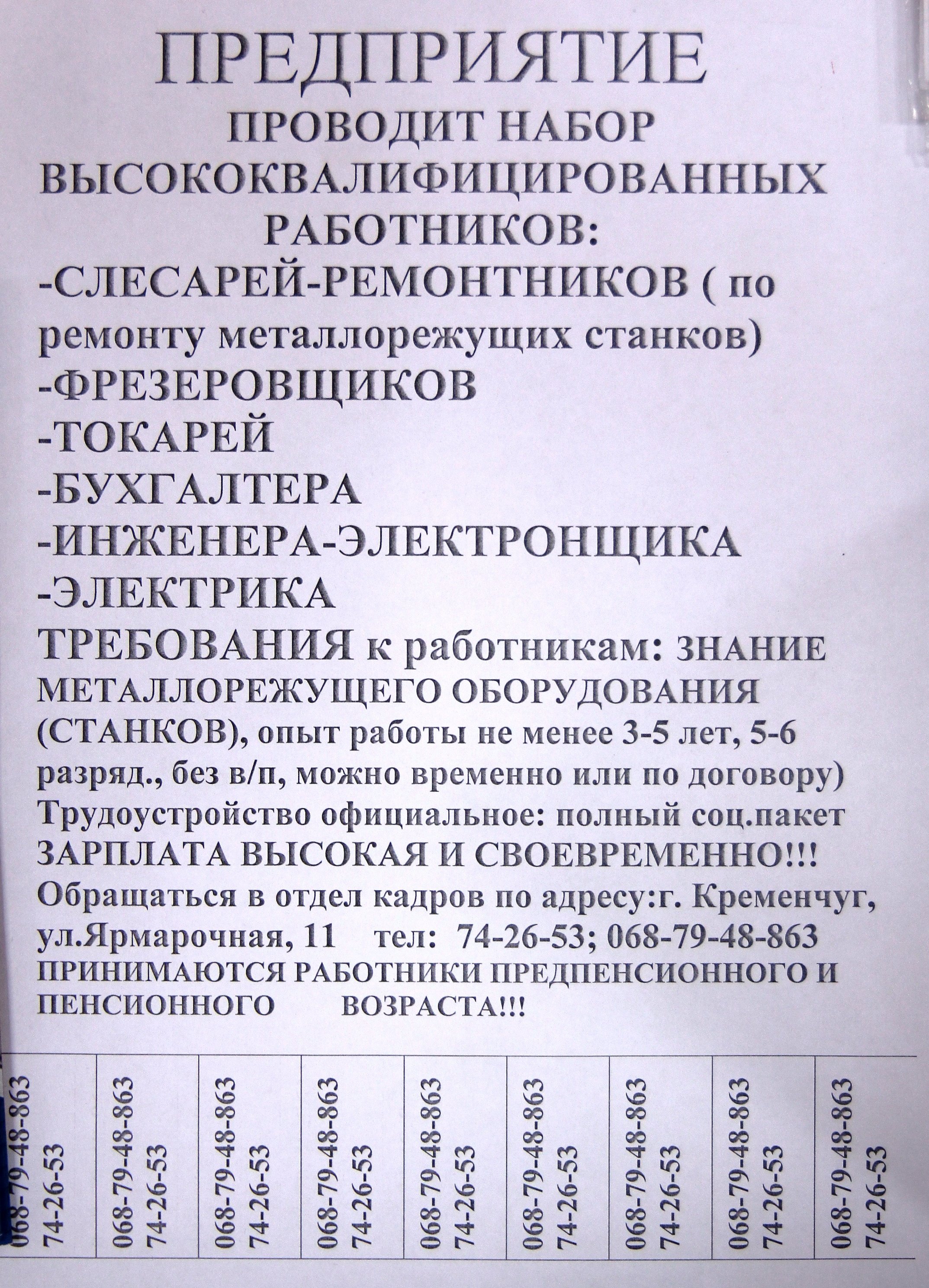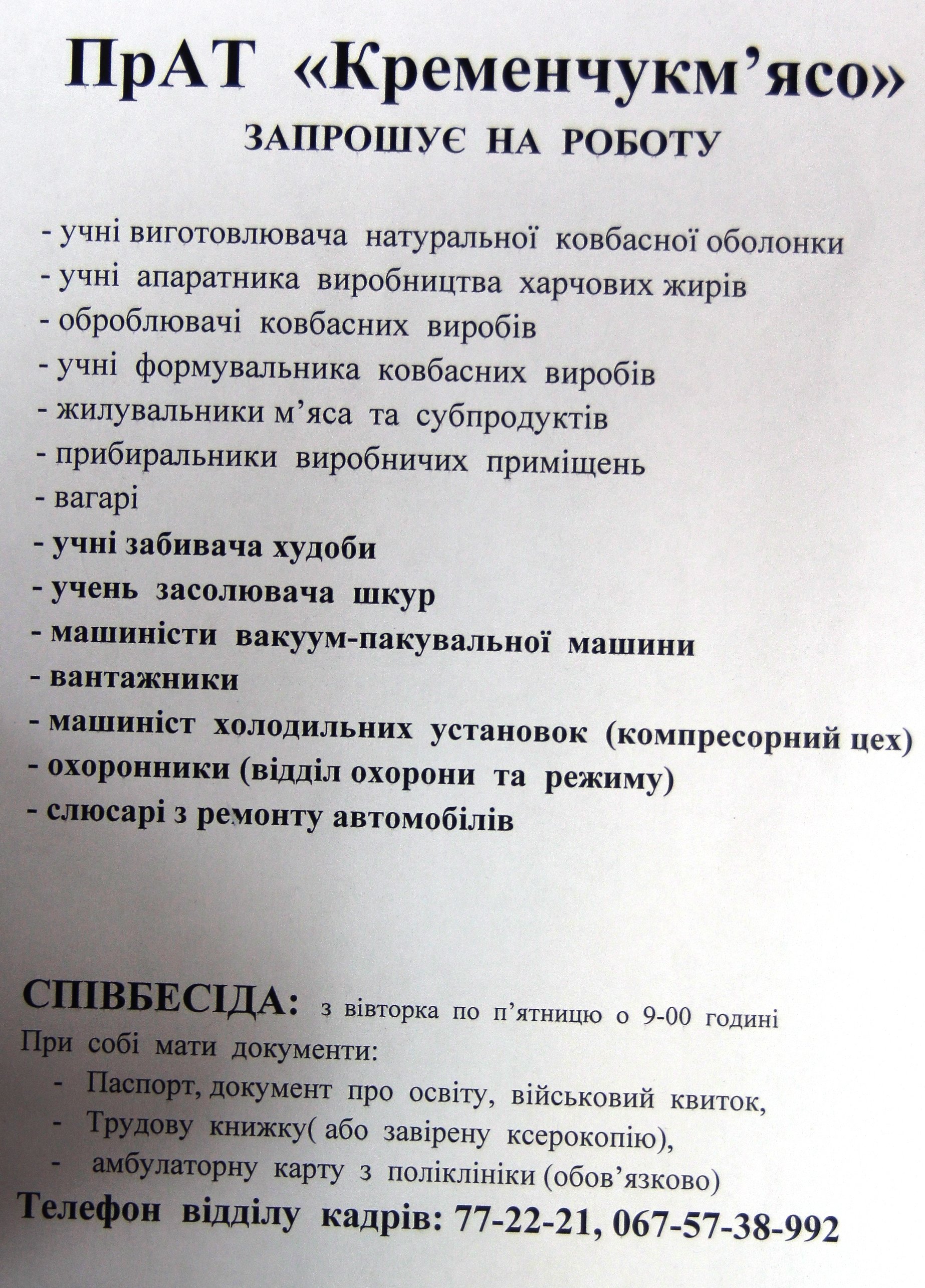 Багато відкритих вакансій на ПрАТ «Кременчукм’ясо»: оброблювачі ковбасних виробів, жилувальники м’яса, прибиральники, вагарі, машиністи пакувальної машини, машиністи холодильних установок, охоронці, слюсарі з ремонту автомобілів та учні.