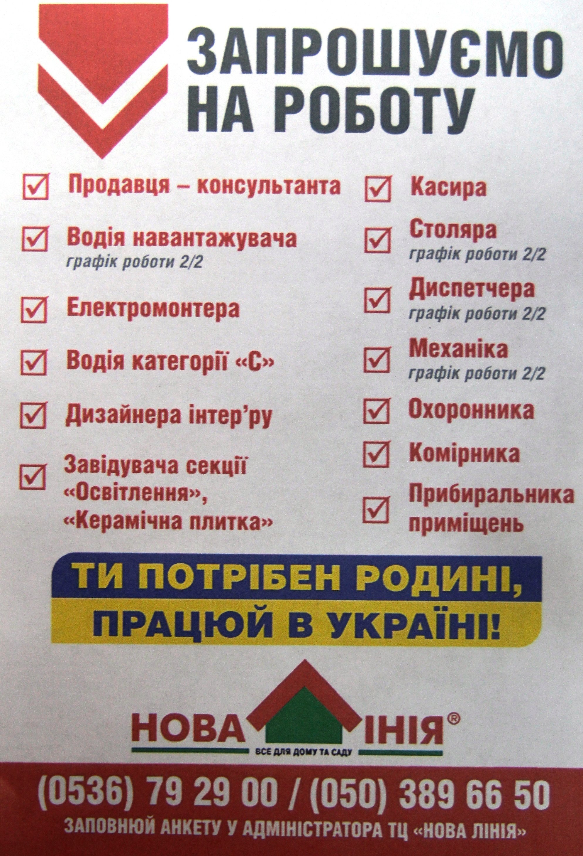 У свою родину запрошує кременчужан «Нова лінія». Тут шукають: продавців, водіїв навантажувача, електромонтера, водія С, дизайнера інтер’єру, завідувачів секцій «Освітлення» та «Керамічна плитка», касирів, столярів, диспетчерів, механіків, охоронців, комірників, прибиральників.