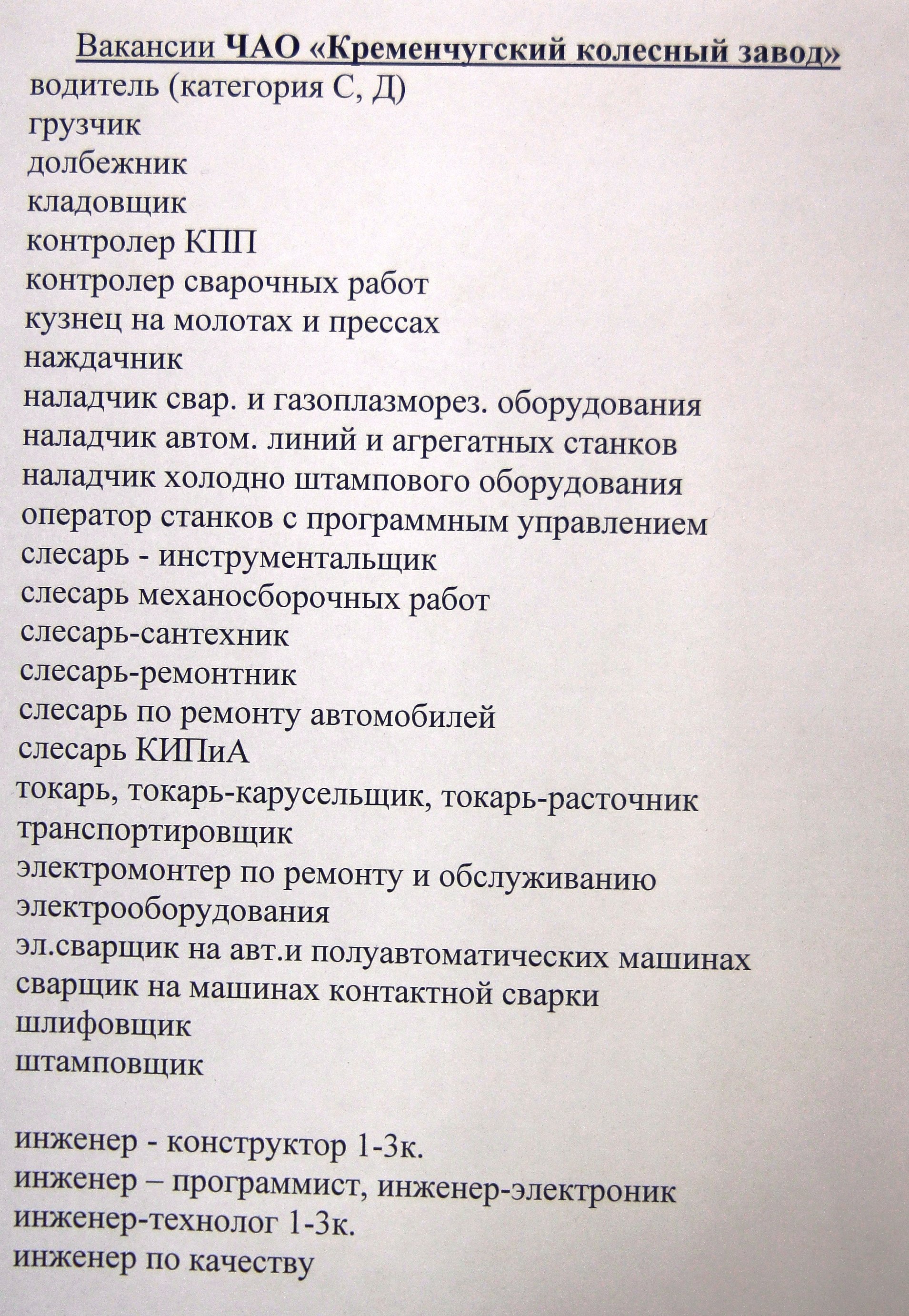 30 вакансій відкрито на ПАО «Кременчуцький колісний завод». Серед них: водії, вантажники, ковалі, наладчики, слюсарі, токарі, електромонтери, зварювальники, шліфувальники, інженери.