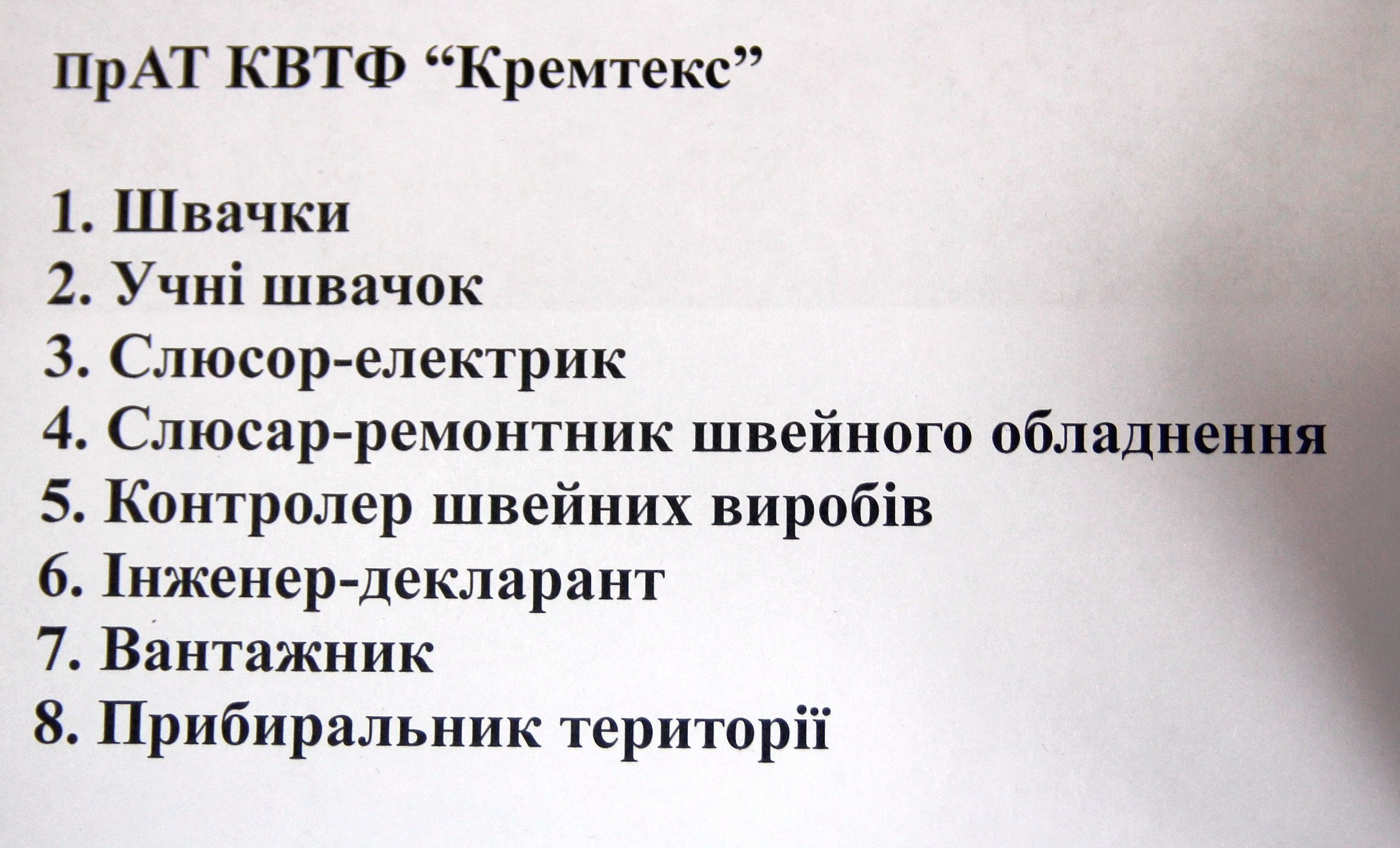 На «Кремтекс» необхідні швачки, слюсарі, контролери швейних виробів, інженери- декларанти, вантажники, прибиральники.