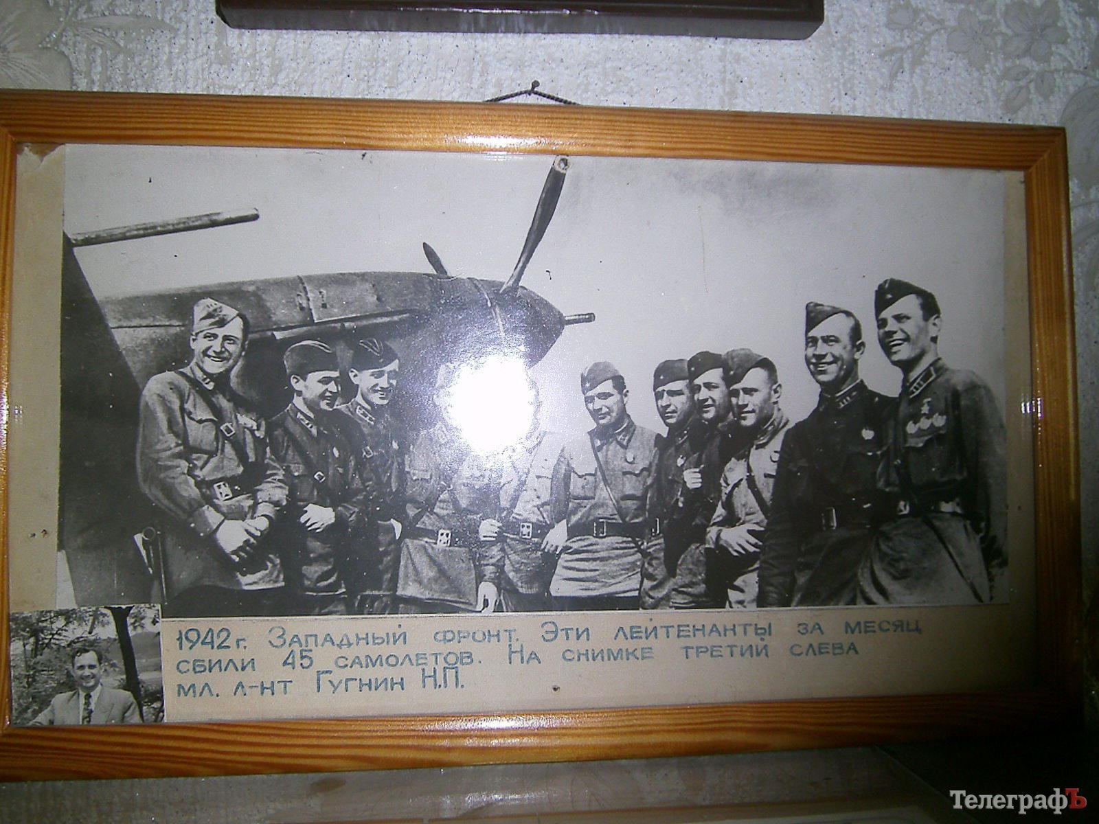 Николай Гугнин (третий слева) с однополчанами. На фото надпись: эти лейтенанты за месяц сбили 45 вражеских самолетов.