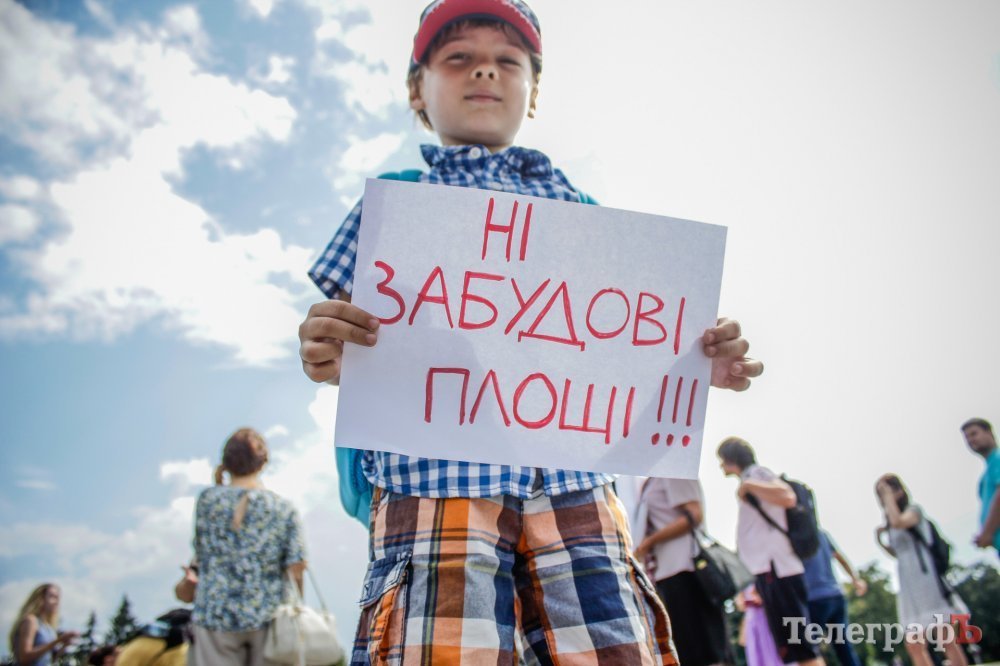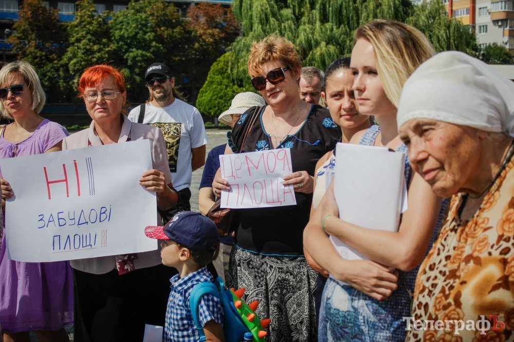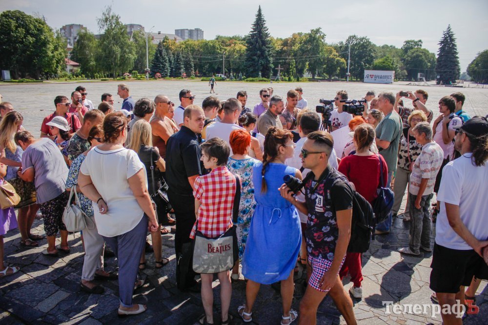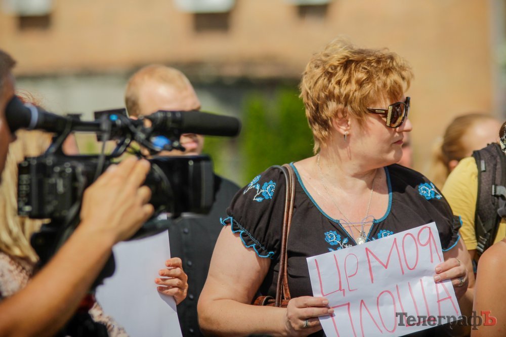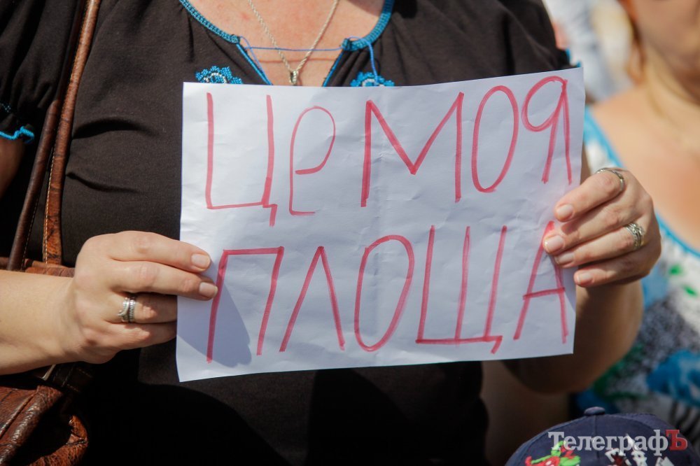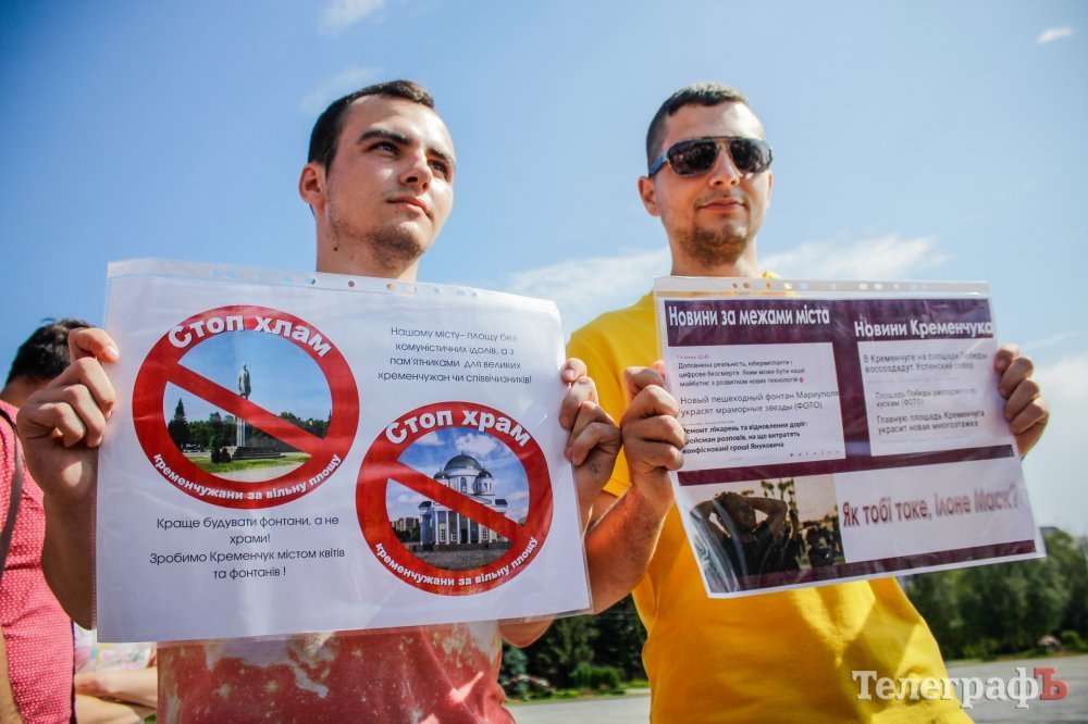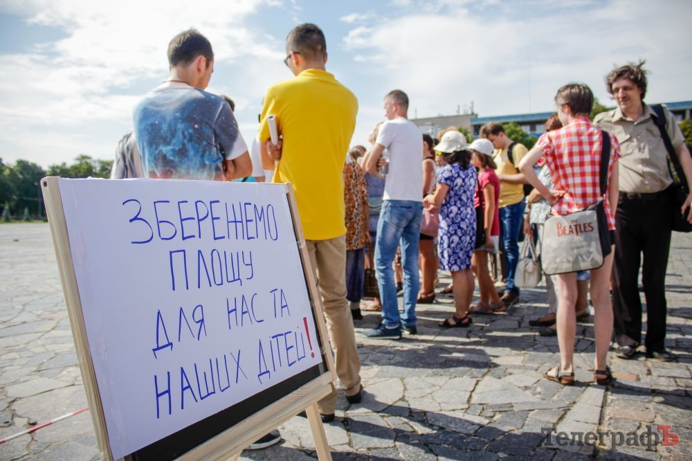 Вечером 22 июля на площади Победы собрались кременчужане, которые выступают против строительства Успенского собора в центре площади. Они утверждают, что выступают не против собора, а против застройки площади вообще – она им нужна без строений.