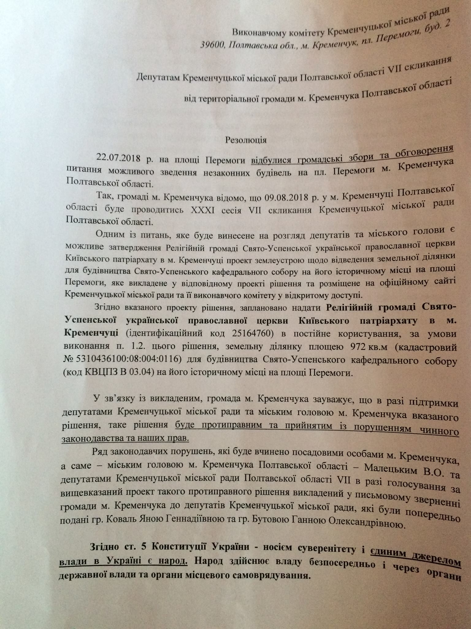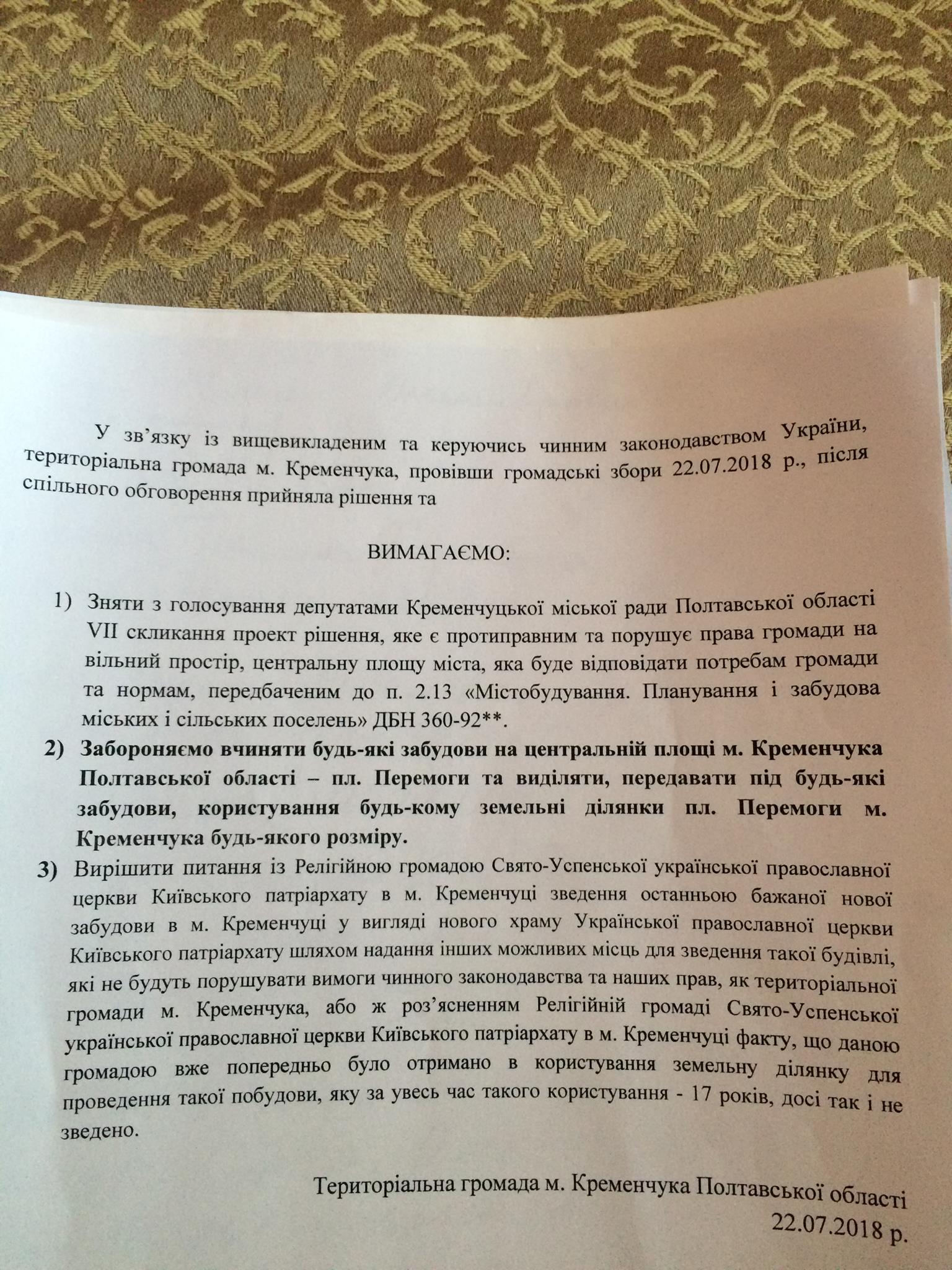 - Снять с голосования горсовета проект решения, которым предлагается утвердить религиозной общине Свято-Успенской Украинской православной церкви Киевского патриархата проект землеустройства, предусматривающий строительство Свято-Успенского кафедрального собора на его историческом месте – на площади Победы.