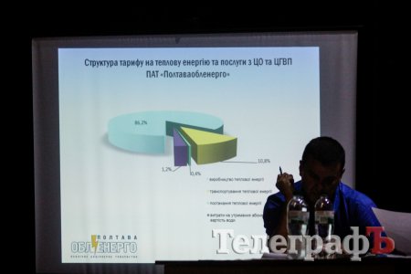 Сегодня, 23 июля, «Полтаваоблэнерго» провело слушания по проекту тарифов на отопление и горячую воду, которые готовится утвердить исполком. В душном малом зале ГДК собралось около 50 человек. Им показали нечитаемые (даже с 3-4 ряда) слайды и долго рассказывали, какие убытки несет компания «Полтаваоблэнерго», не повышая тарифы. Докладывала Ольга Ревега, заместитель директора Кременчугской ТЭЦ «Полтаваоблэнерго» по финансовым вопросам. Она проинформировала, что компания «Полтаваоблэнерго» подала расчеты в исполком. Проект новых тарифов был опубликован на сайте компании и на сайте исполкома. Никаких предложений ни от физлиц, ни от юрлиц не поступило.