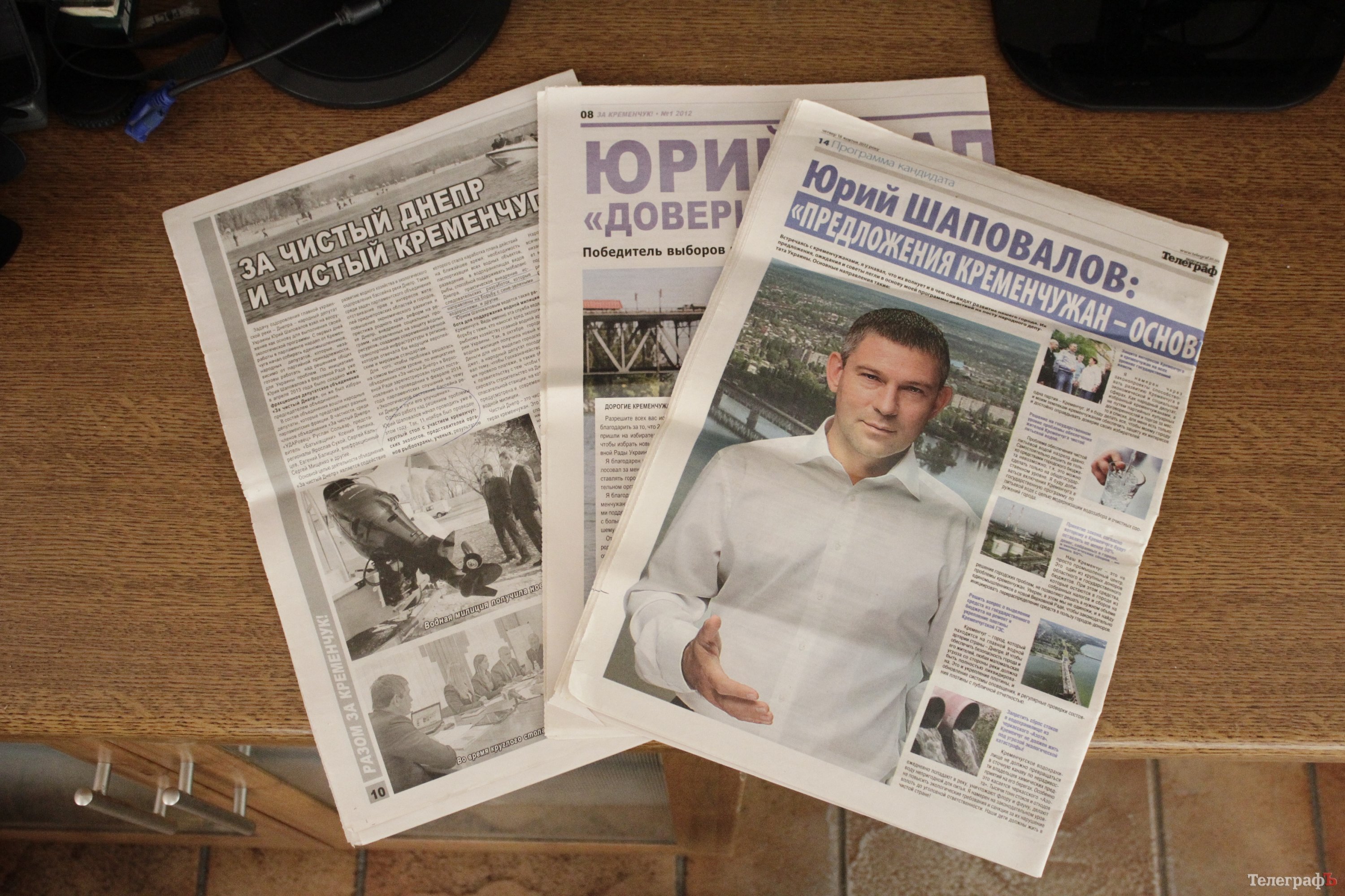 Теперь о том, на каком основании «Телеграф» критично оценивает участие нардепа Шаповалова в борьбе за спасение Днепра. Основанием для нас являются результаты его предыдущей деятельности по спасению Днепра. В 2012-м, во время парламентских выборов, кандидат Шаповалов пообещал кременчугским избирателям «вирішення на державному рівні проблеми забезпечення мешканців Кременчука чистою питною водою». Кременчуг берет питьевую воду из Днепра.