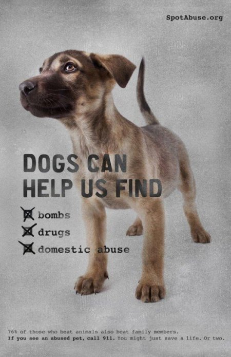 Надпись на плакате: 76% тех, кто поднимал руку на животных, избивал и членов семьи. Если вы заметили животное, с которым плохо обращаются, звоните 911. Вы можете спасти жизнь. Или две. Кампания Spot Abuse Project