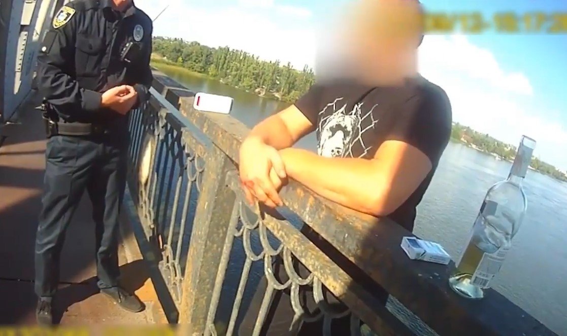 Патрульные полицейские предоставили видео с нагрудных камер, на которых зафиксирован случай на Крюковском мосту, когда молодой человек собирался прыгнуть вниз. Его отговорили от этой затеи двое полицейских – младший лейтенант Руслан Грищенко и рядовой полиции Богдан Запорожец.