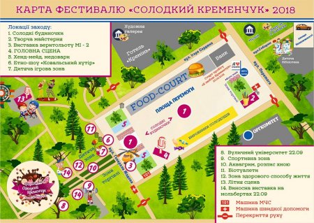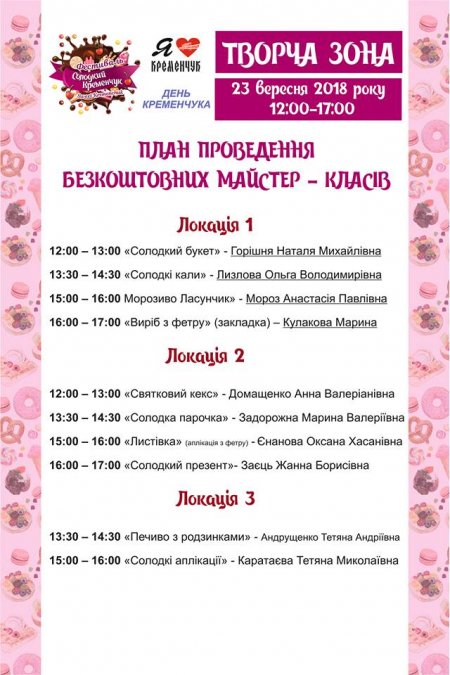 22-23 вересня, у рамках святкування 447-ї річниці з Дня заснування міста та 75-ї річниці його визволення від загарбників, у Кременчуці відбудеться фестиваль солодощів «Солодкий Кременчук», на якому будуть презентувати, готувати, куштувати і оцінювати смачні вироби. На кременчужан чекає насичена заходами 2-денна програма, тож «ТелеграфЪ» впорядкував усі анонсовані заходи за днями, часом і локаціями.