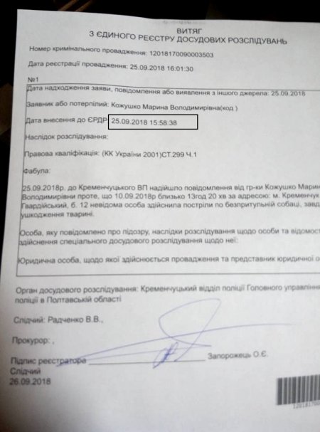 Кременчугская полиция тормозит расследование дела о собаке, в которую 10 сентября стреляли на детской площадке. Это выяснилось после того, как 25 сентября заместитель директора КП «Спецсервис-Кременчуг» Марина Кожушко пошла в полицию, чтобы передать доказательства: пулю из пневматического оружия, которую достали при операции, и заключение ветеринара. Тогда Марина и выяснила, что уголовное производство не внесено Единый реестр досудебных расследований (ЕРДР) — об этом ей сказали в Кременчугском городском отделе полиции.