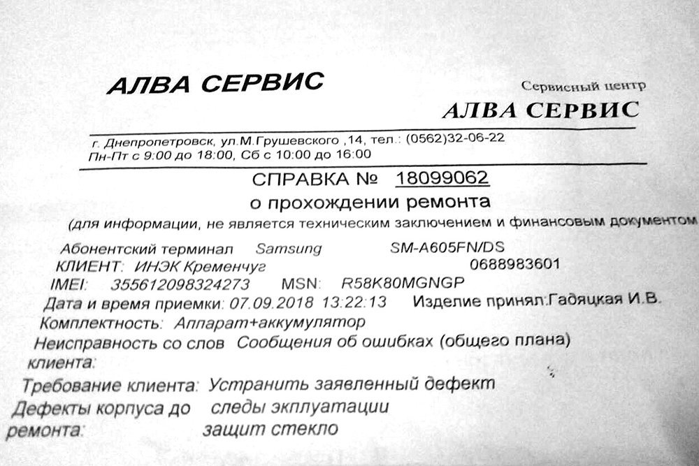 7 сентября нам позвонили из сервисного центра. Предложили два варианта решения проблемы. Они снимают телефон с гарантии, ремонтируют и это обойдется нам в 810 грн. Или нам меняют плату, мы доплачиваем 5 тыс грн и телефон остается на гарантии. Мы спросили, что конкретно с телефоном. Ответа не услышали. Мы не согласились ни на один из предложенных вариантов. На следующий день нам позвонили из сервисного центра и сказали, что телефон починили, но он автоматически снят с гарантии, потому что во время диагностики обнаружено нарушение Root-прав. С нас 810 грн. Нам предоставили справку о прохождении ремонта: обнаружено стороннее вмешательство в программное обеспечение телефона, и в гарантийном обслуживании отказано. Но на этой же бумажке указано, что она не является техническим заключением или финансовым документом. Вернулись в магазин. Спросили, поменяют ли его нам, если мы вернем им уже исправный телефон из ремонта. Ничего конкретного нам не пообещали. Вечером мы забрали телефон из сервисного центра, заплатили за ремонт. Принесли в магазин. Нам ответили, что замену делать не будут.