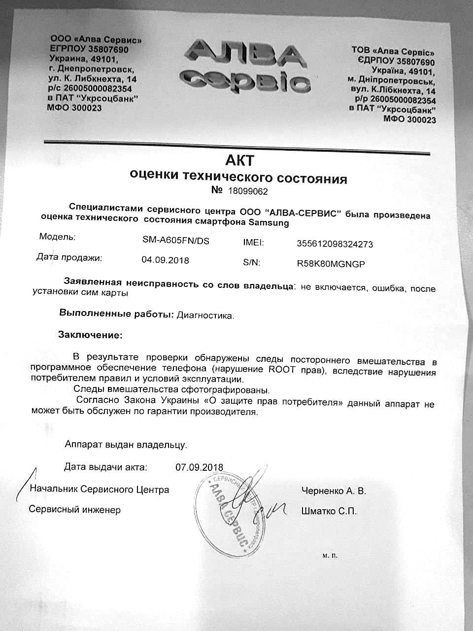 – Потребителем Рожко Ю.П. 4 сентября 2018 был приобретен Samsung Galaxy A6 +. (далее – «Товар»). 5 сентября потребитель Рожко обратилась в магазин в устном порядке с целью получения консультации касательно ее действий в случае обнаружения в приобретенном товаре недостатков. В ответ на вышеуказанное обращение Потребителю была разъяснена возможность (согласно ч.3 ст. 8 Закона Украины «О защите прав потребителей») ее собственного выбора обратиться или в магазин, или в авторизованный сервисный центр производителя Товара для проведения диагностики и при необходимости гарантийного ремонта товара. 7 сентября в адрес магазина от Потребителя поступило заявление о предоставлении из обменного фонда аналогичного Товара на время проведения гарантийного ремонта ранее приобретенного потребителем. Поскольку Потребитель по собственному выбору обратился к представителю производителя (в виде авторизованного сервисного центра) для проведения гарантийного ремонта Товара, то его требования о предоставлении подменного фонда должна удовлетворить именно та организация, которой и был передан Товар под гарантийное обслуживание. (Соответственно ч.5 . ст.8 Закона Украины «О защите прав потребителей»). О вышеуказанном Потребителя известили соответствующим письмом. 9 сентября 2018г. Потребитель в устном порядке обратилась в магазин со справкой №18099062 «о прохождении ремонта», выданной СЦ «АЛВА СЕРВИС» 07.09.2018г., с целью проведения обмена товара или возврата ранее уплаченных денежных средств. Для выяснения технического состояния Товара магазин Эльдорадо обратился к СЦ «АЛВА СЕРВИС». В ответ на обращение СЦ «АЛВА СЕРВИС» было предоставлено «Акт оценки технического состояния № 18099062» от 07.09.2018 года, согласно с которым в результате диагностики Товара были обнаружены следы постороннего вмешательства в программное обеспечение Товара, что являет собой нарушение условий гарантийного обслуживания товара. Порядок возврата средств, уплаченных за товар, который использовался и, по мнению потребителя, имеет определенный недостаток, и обмена товара не надлежащего качества на алогичный товар надлежащего качества регламентируется и четко установленный ст. 8 Закона Украины «О защите прав потребителей» (цитируется закон – ред.). …Из изложенных норм Закона видно, что возврат уплаченных за товар денежных средств или замена товара на антологичный возможна исключительно в случаях, когда в таком товаре имеется существенный недостаток по вине производителя. В случае выхода товара из строя по вине потребителя (невыполнение правил эксплуатации), отсутствия предусмотренных эксплуатационными документами пломб, гарантийного талона потребитель теряет право на гарантийное обслуживание. …В связи с имеющимися механическими повреждениями ООО «Диеса» не имеет правовых оснований удовлетворить требование Потребителя Рожко Ю.П. о расторжении договора купли-продажи и возврате уплаченных за товар средств при отсутствии в Товаре существенного недостатка и имеющихся нарушений Потребителем условий эксплуатации Товара, что подтверждается Актом оценки технического состояния № 18099062 от 07.09.2018р., изданном СЦ «АЛВА СЕРВИС».