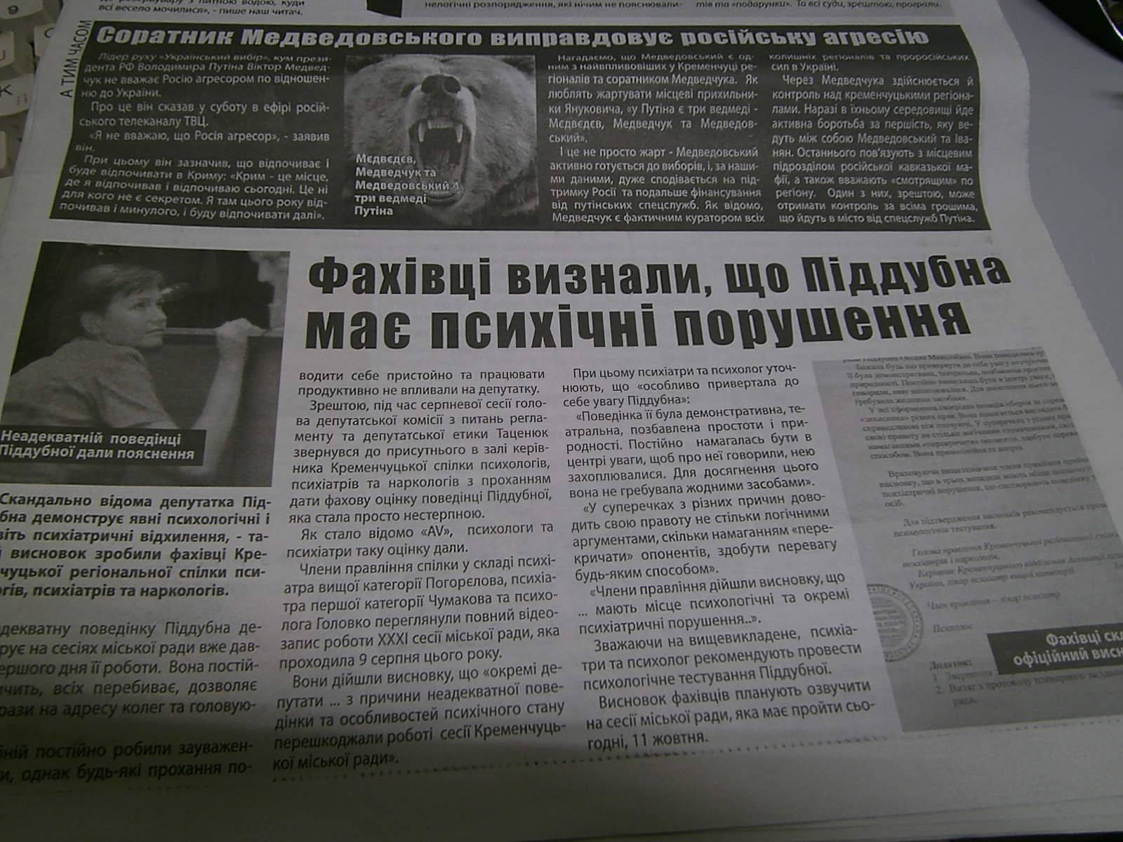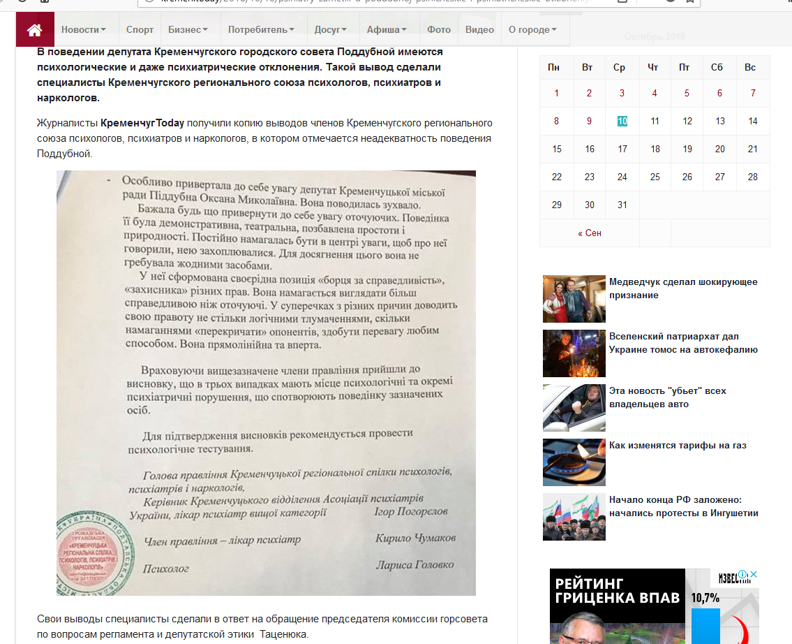 Выступление депутата Пиддубной было без иносказаний и намеков. Она сообщила, что 10-го октября на «провластном сайте» появилась информация о том, что в её поведении психиатры якобы заметили психологические и психические отклонения и рекомендуют пройти психологическое тестирование. Кроме того, на провластном сайте была представлена скан-копия страницы из какого-то документа. Эта страница была заверена мокрой печатью общественной организации «Кременчуцька регіональна спілка психологів, психіатрів та наркологів”. Там же были указаны фамилии трех врачей, якобы проводивших исследование. Среди них – фамилия главы правления “спілки” – психиатра высшей категории Игоря Погорелова.