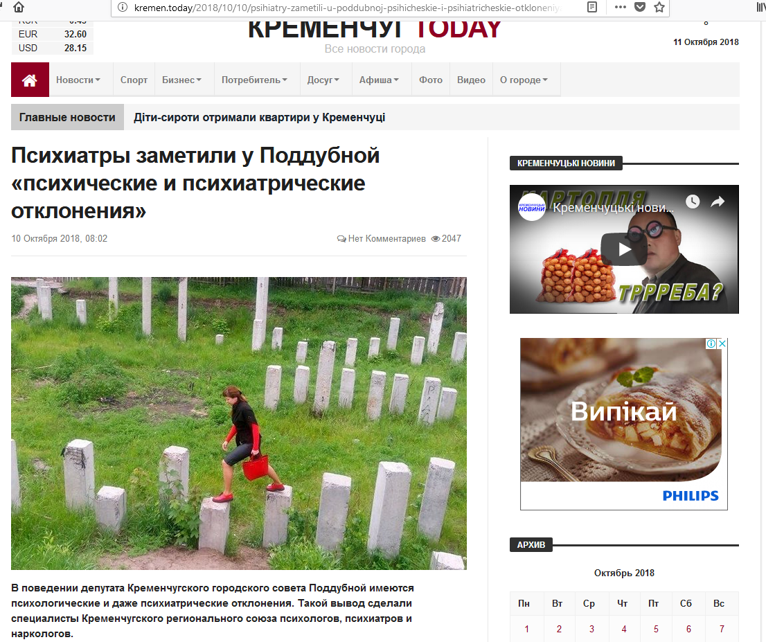 Смотрите сами, что было опубликовано. 10-го октября информация появилась на сайте Кременчуг Today. Этот сайт часто называют провластным, потому что там публикуется исключительно хвалебная информация о мэре Кременчуга Малецком и нардепе Шаповалове. В то же время там регулярно публикуется информация негативного характера о депутате Пиддубной.