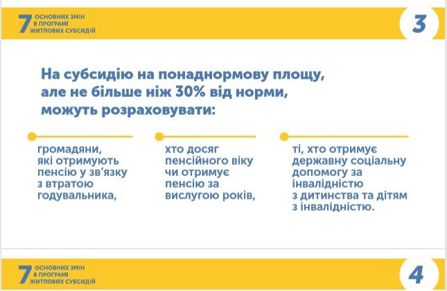 - Уряд розширив перелік категорій, яким може бути призначена субсидія на площу, що перевищує соціальну норму. На понаднормову площу, але не більше ніж 30% від норми, мають право:
