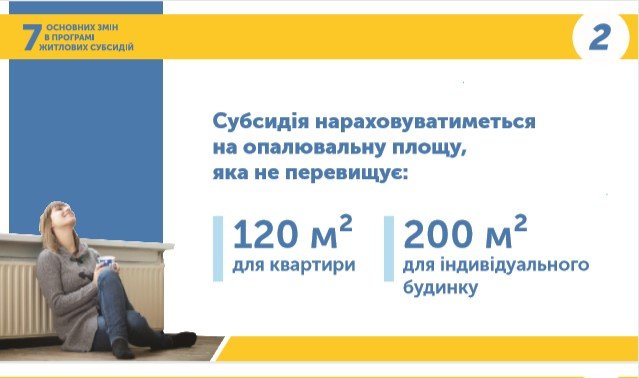- Уряд послабив обмеження для помешкань великої площі. Право на субсидію тепер мають ті родини, опалювальна, а не загальна, площа житла яких не перевищує 120 кв. метрів для квартири та 200 кв. метрів для індивідуального будинку. (Раніше обмеження стосувалися загальної площі, не враховуючи те, що, наприклад, частину цієї площі у приватному будинку може займати вбудований гараж).