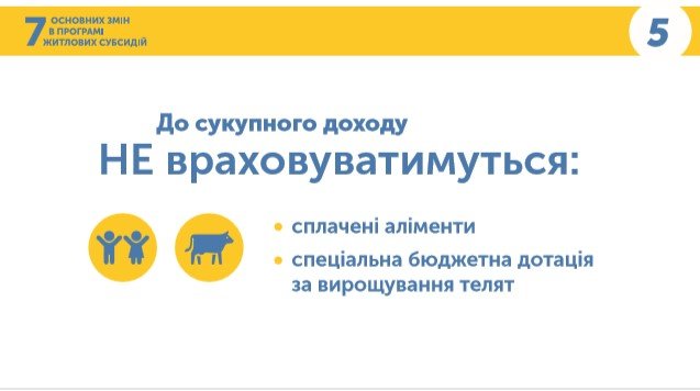 - Мінус аліменти: що не враховується до сукупного доходу. При розрахунку житлової субсидії до сукупного доходу не враховуються сплачені аліменти, Також не враховується спеціальна бюджетна дотація за вирощування молодняка великої рогатої худоби, яка в рік складає до 2500 гривень за голову.