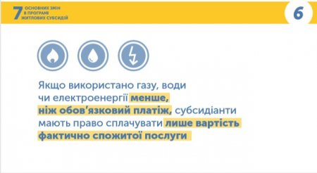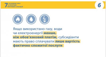 - Зміни стосовно сплати обов’язкового платежу. З 1 жовтня, якщо вартість фактично спожитої послуги менша обсягу обов’язкового платежу, субсидіант має право сплачувати лише вартість фактично спожитої послуги. Наприклад, якщо розмір обов’язкового платежу за певну послугу становить 200 гривень на місяць, але домогосподарство реально її спожило тільки на 120 гривень, сплаті підлягатиме фактичний обсяг споживання, тобто 120 грн.