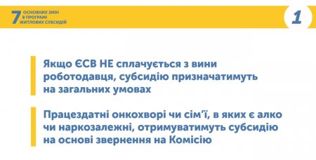- Послаблення щодо нульових доходів. У разі якщо член домогосподарства не має доходів, бо перебуває у складних життєвих обставинах через хворобу, або в складі домогосподарства є працездатні алко- чи наркозалежні (за наявності довідки від лікаря), онкохворі (за наявності висновку ЛКК), субсидію вправі призначити комісія з питань призначення житлових субсидій.