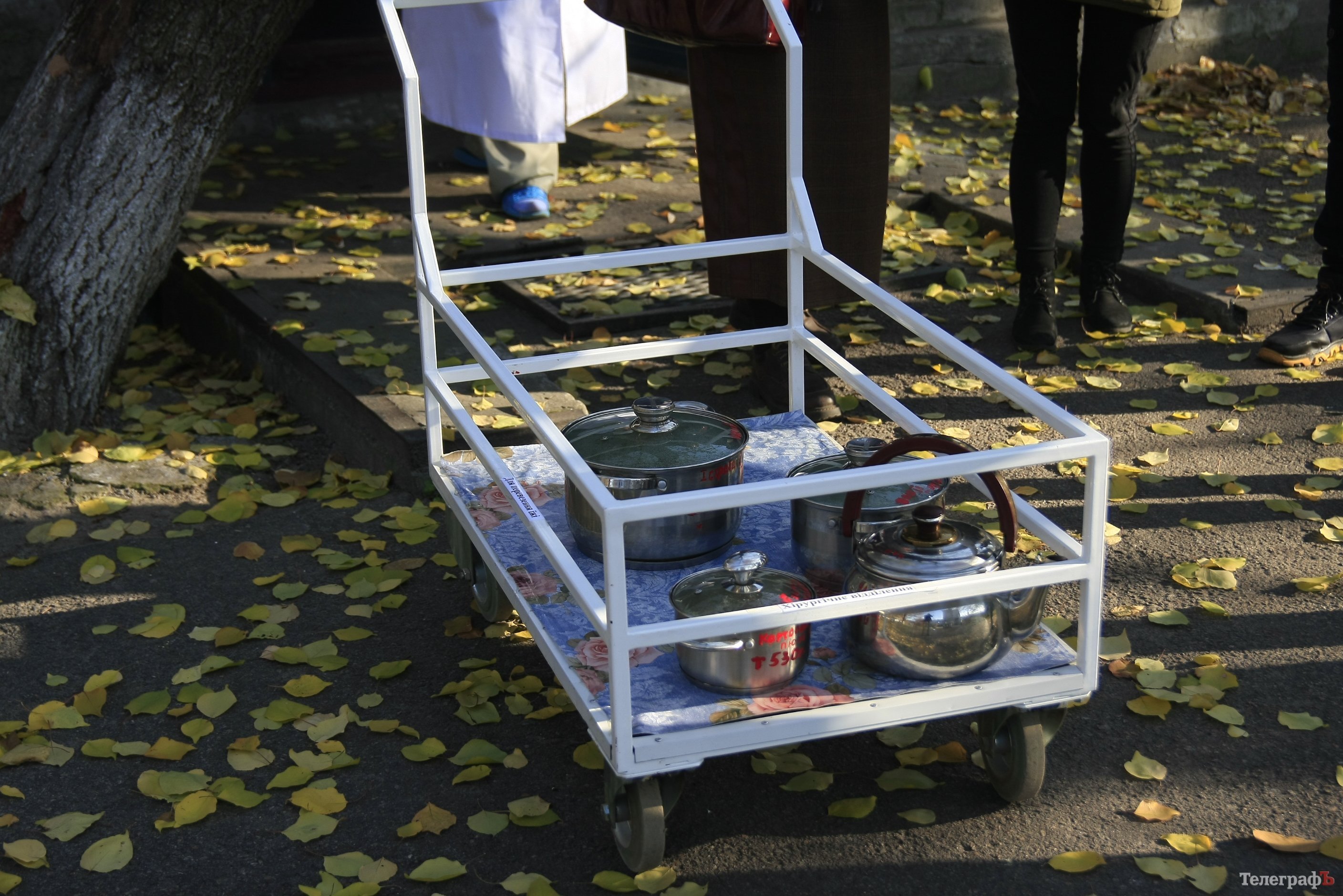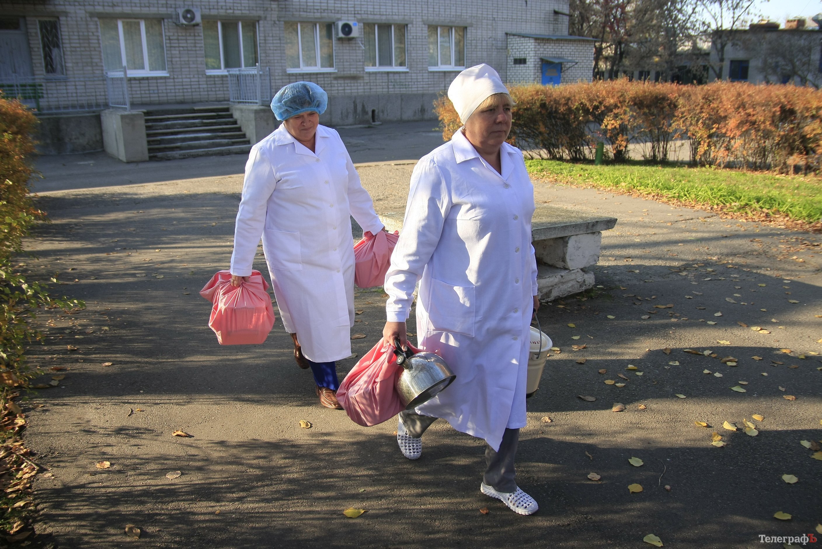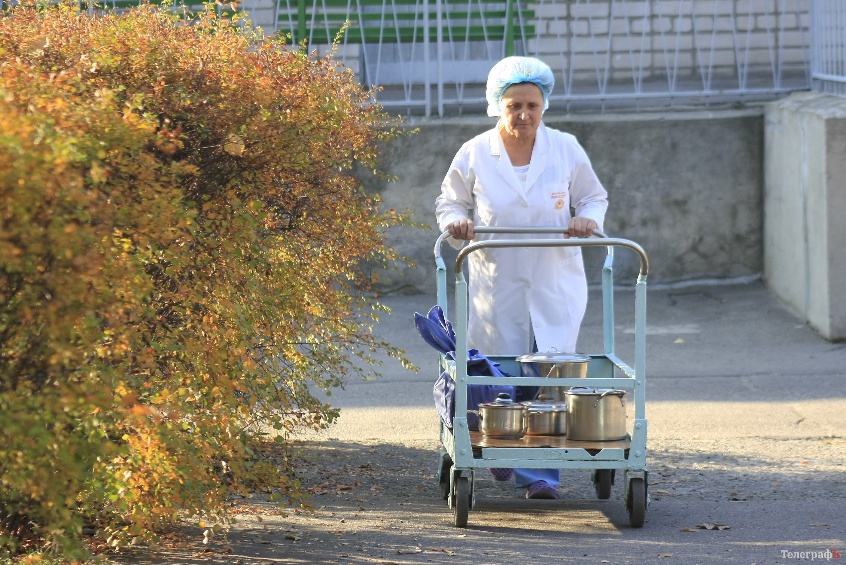 На самом деле, тележки, в которых санитарки доставляют еду с пищеблока в отделения, очень тяжелые, и тащить их, да ещё с полными кастрюлями, тяжело. В октябре санитарки тихонечко пожаловались, что в переходе, через который везут тележки с едой, очень плохой пол, можно поскользнуться, зацепиться и упасть.