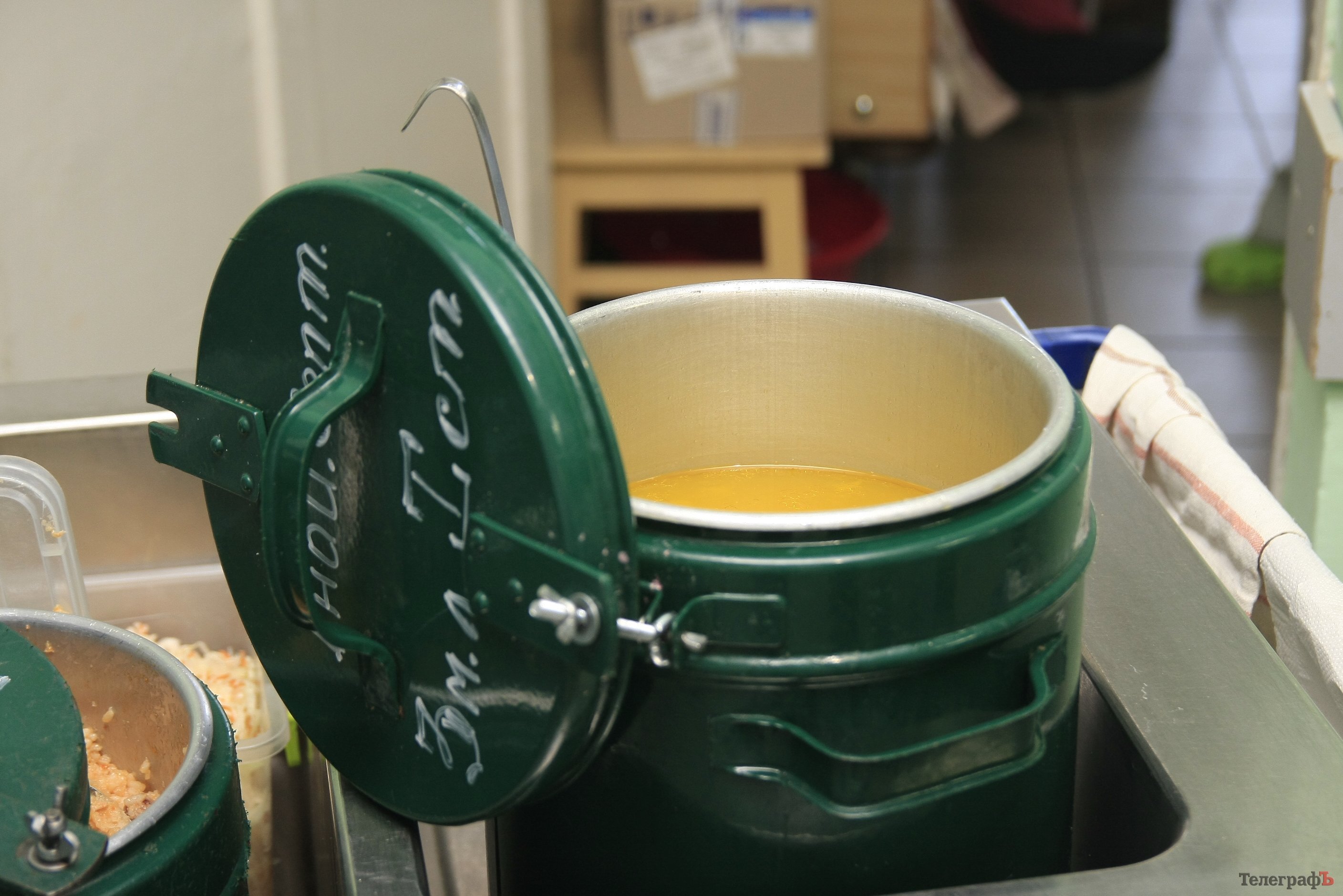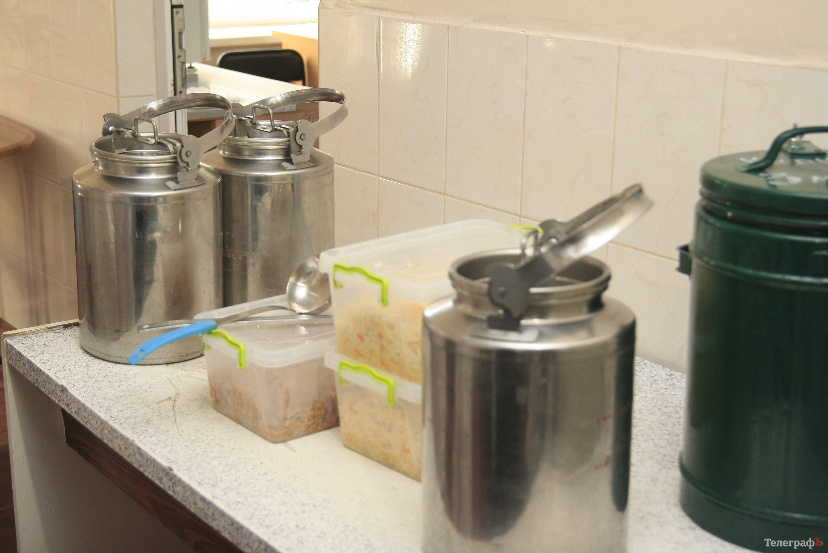 В «Кременчугской» нет своего пищеблока, питание сюда привозят из расположенной рядом водолечебницы (больница восстановительного лечения). В «Кременчугской» журналисты впервые увидели, что пищу сюда доставили в специальных баках с фиксированной крышкой, а не в бытовых кастрюльках, с которых при транспортировке в любой момент может слететь крышка – такие кастрюльки пресса видела в детской больнице. Большая часть баков – собственность пищеблока водолечебницы. Некоторое количество новых баков приобрела фирма «Понтем.уа», занимающаяся организацией питания в кременчугских больницах.