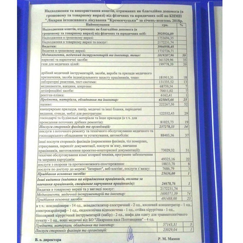 В хорошо иллюстрированном отчете перечисляется медтехника, приобретенная за деньги пациентов, а также другой инвентарь. А в таблице ниже указаны не только траты, но и суммы поступлений.