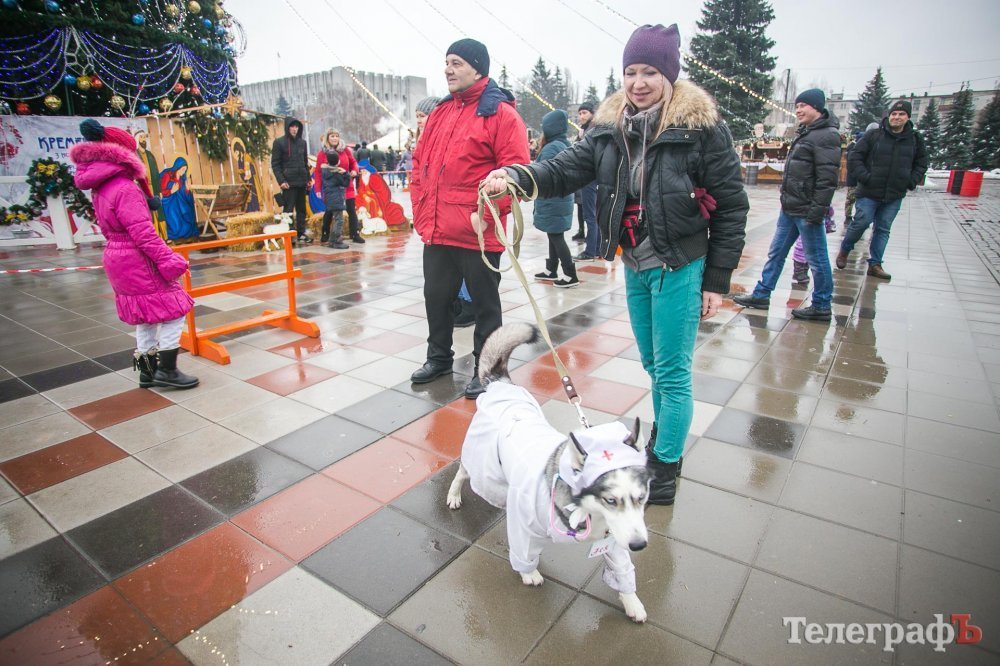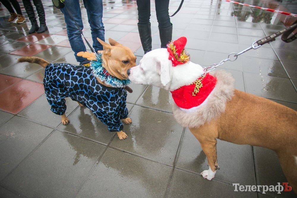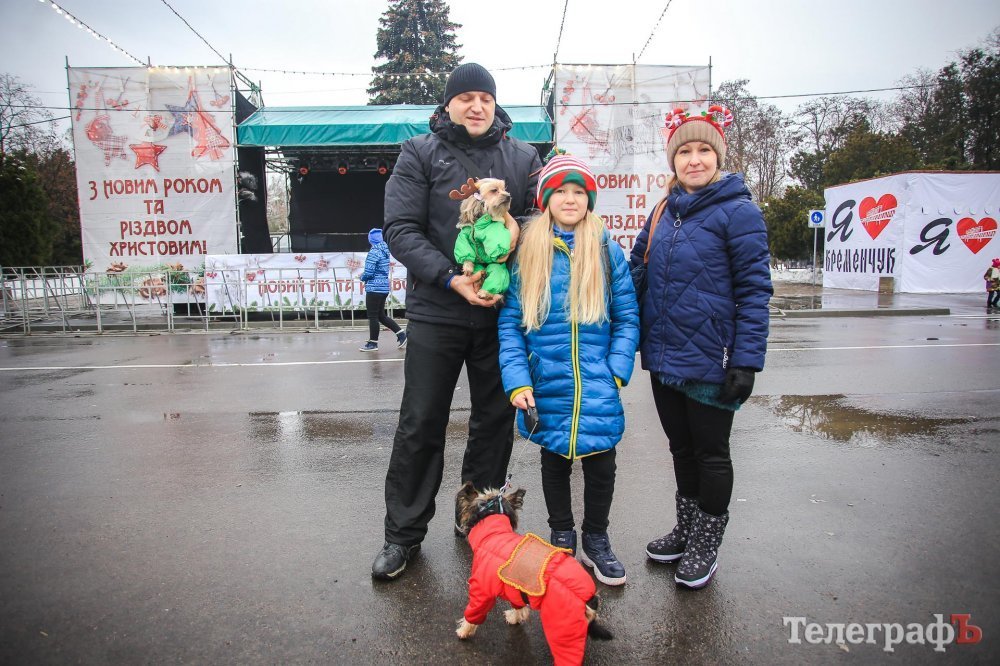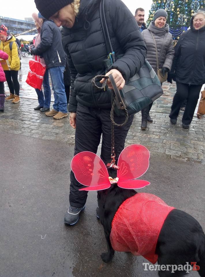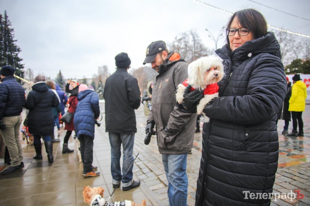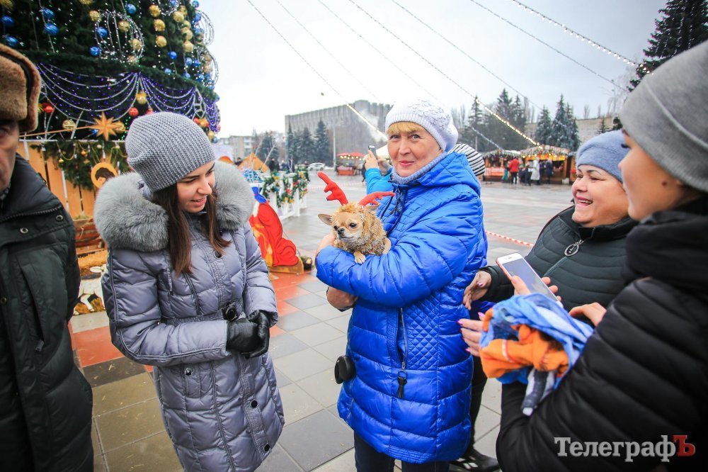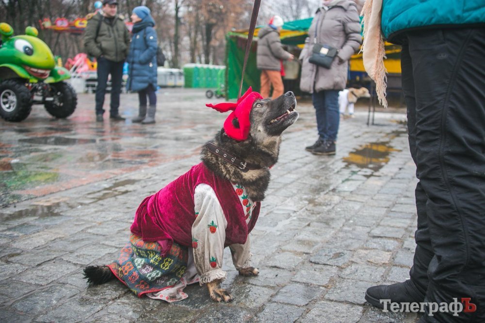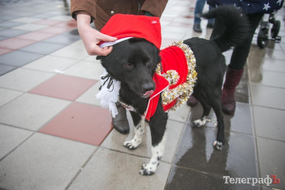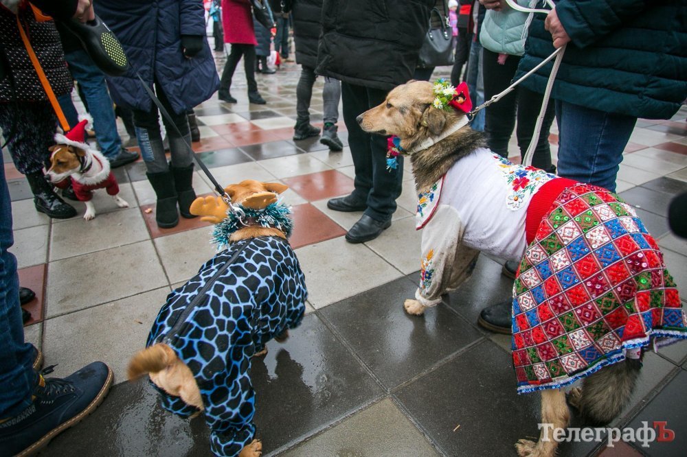Кременчужане под главной ёлкой города сегодня провожали год Собаки – домашние и бездомные символы уходящего года приоделись в костюмы. Больше всего было Санта Клаусов и веселых оленей.