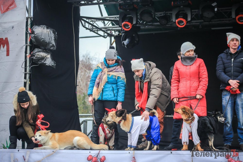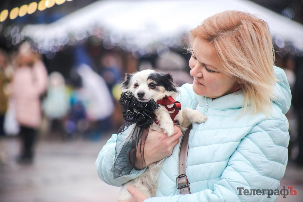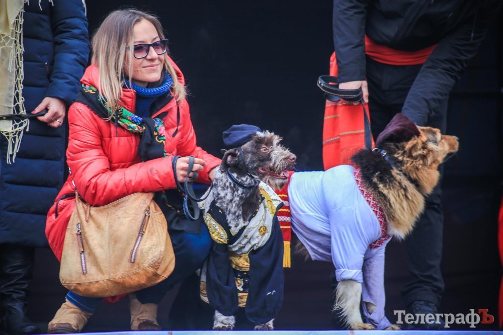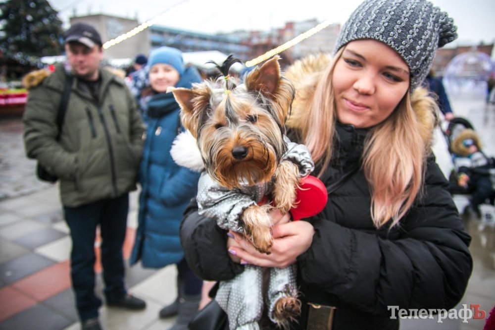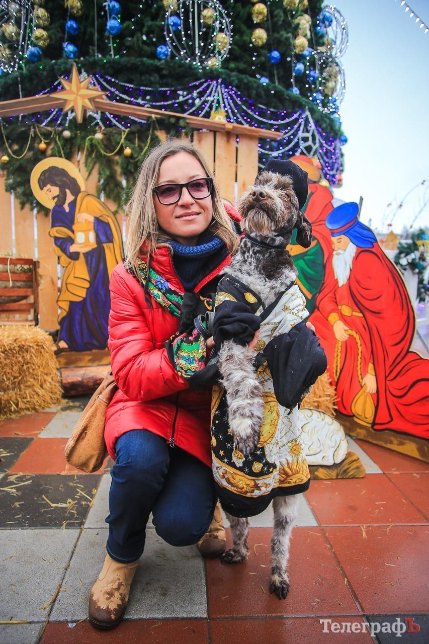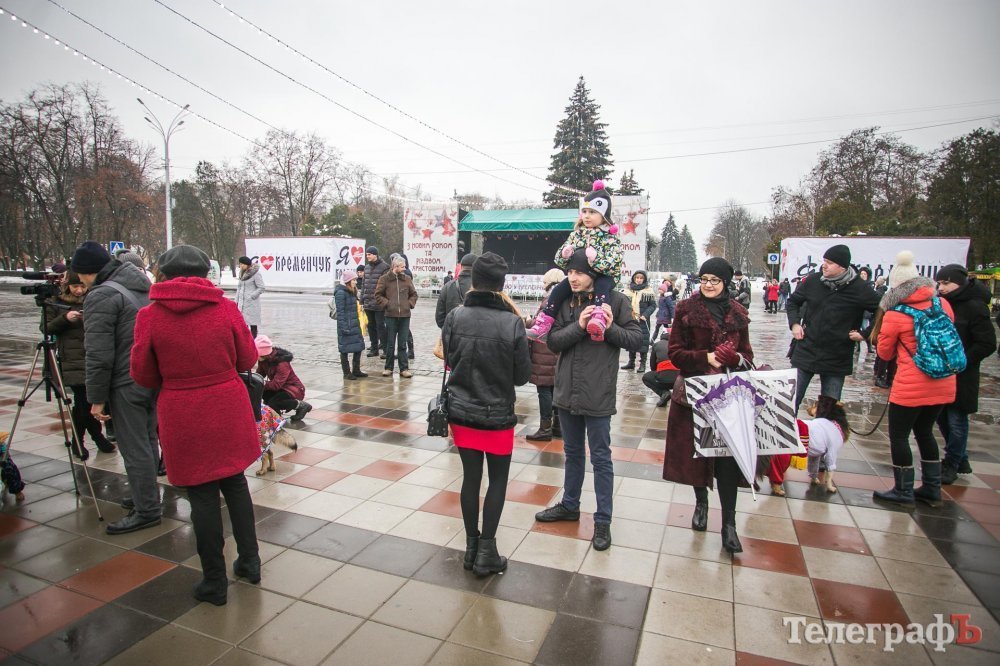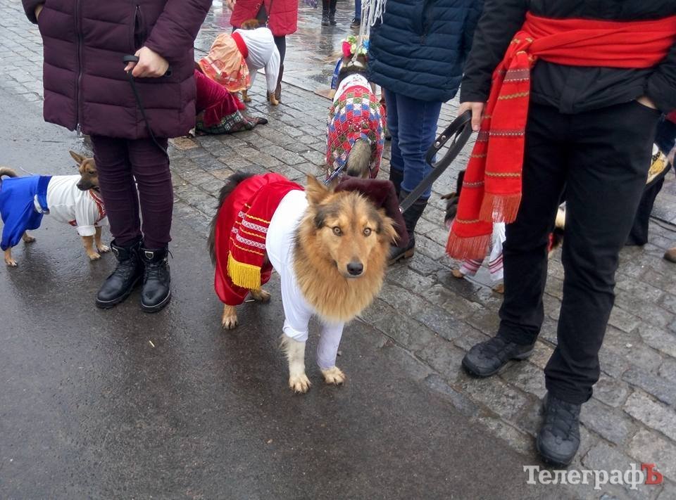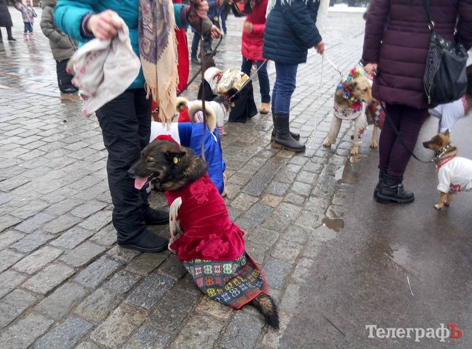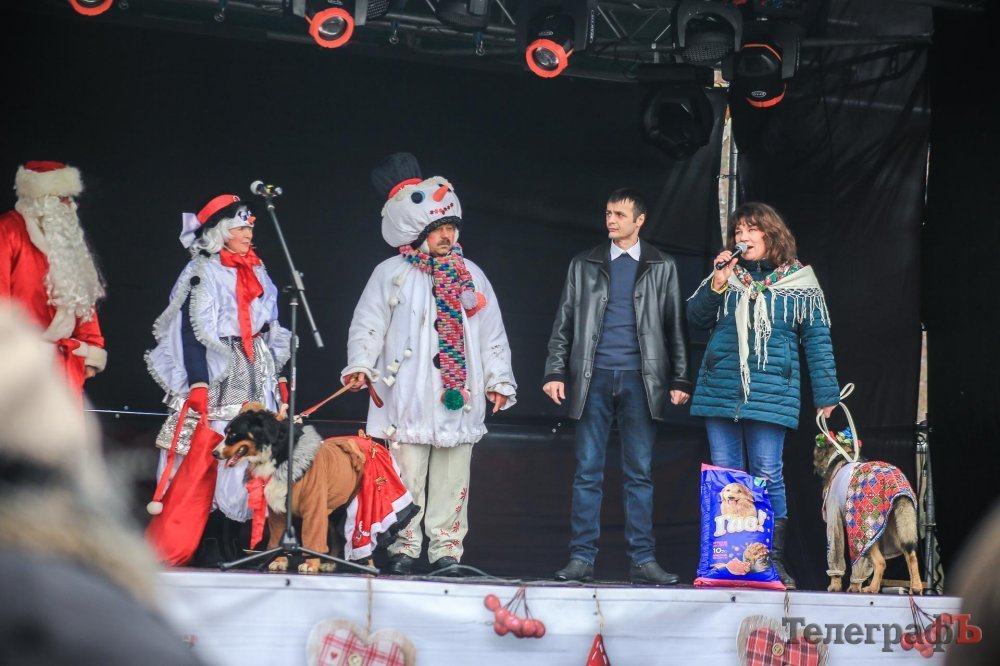 Кременчужане под главной ёлкой города сегодня провожали год Собаки – домашние и бездомные символы уходящего года приоделись в костюмы. Больше всего было Санта Клаусов и веселых оленей.