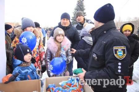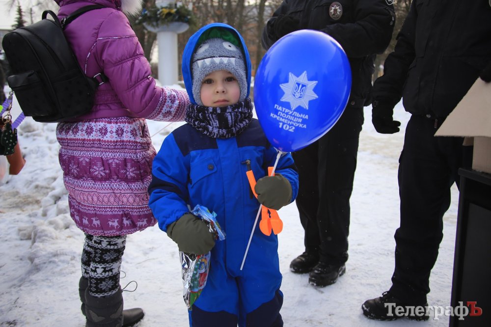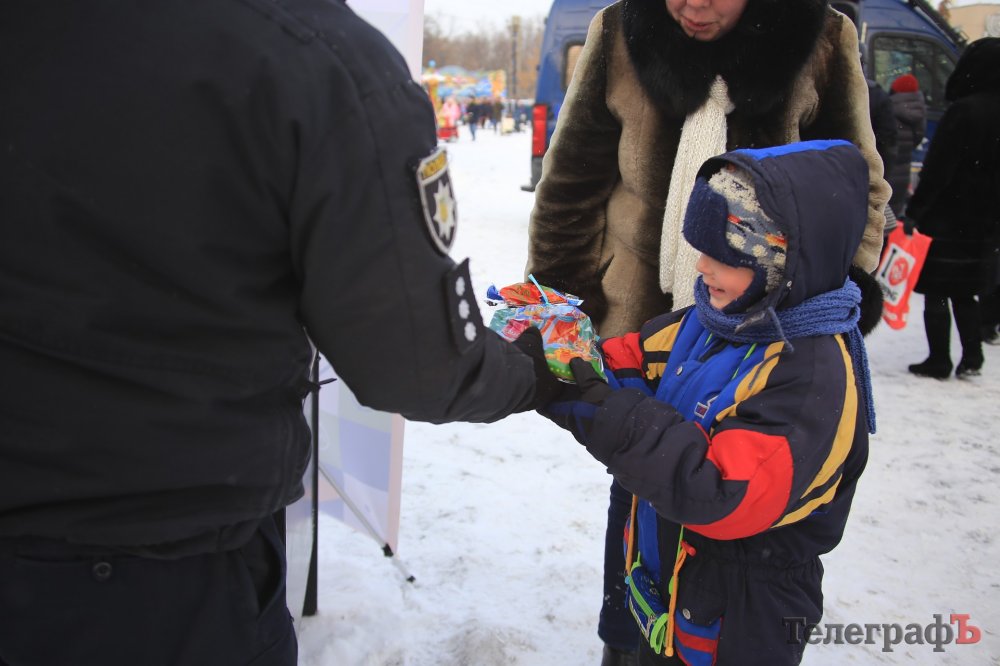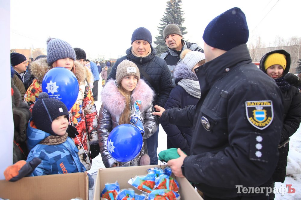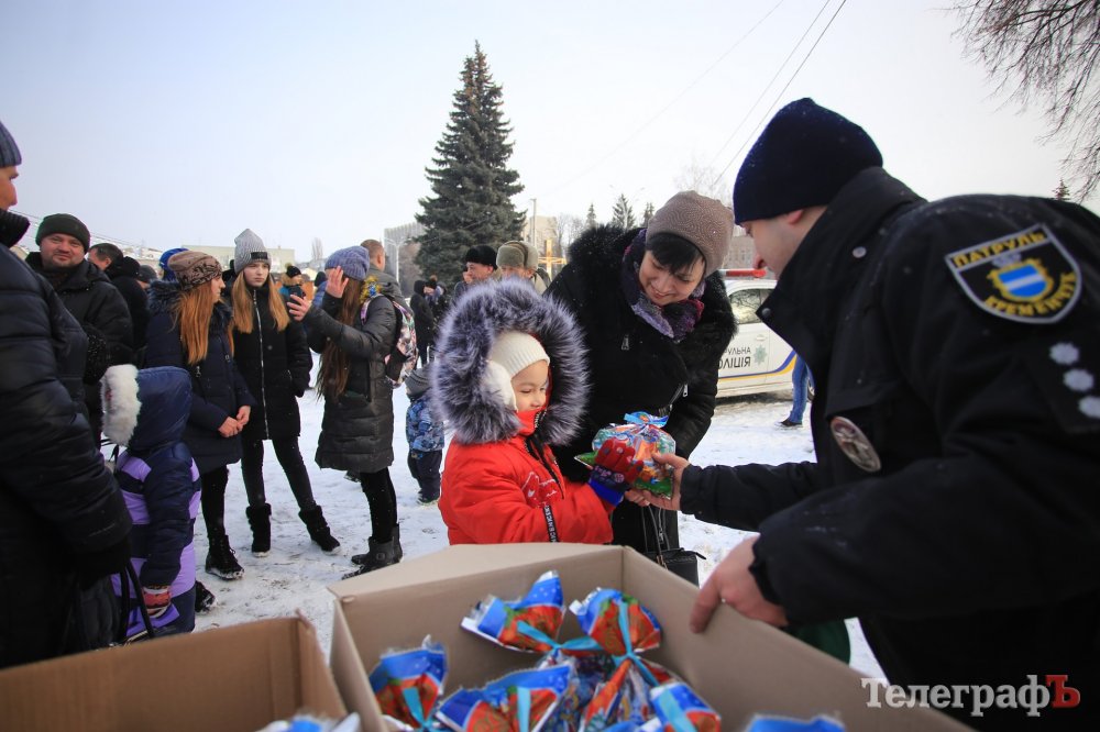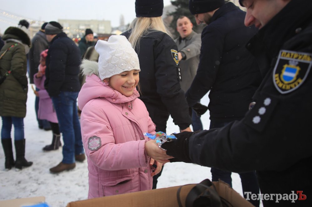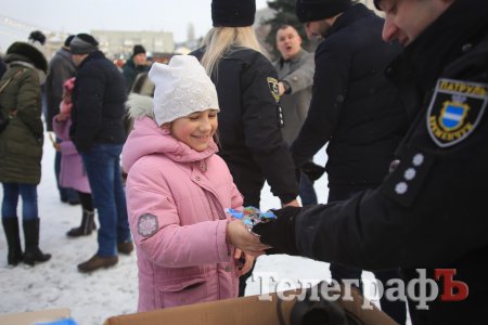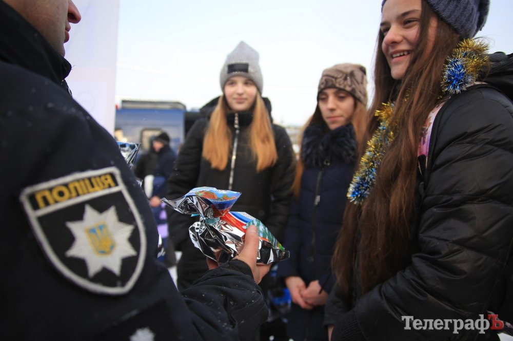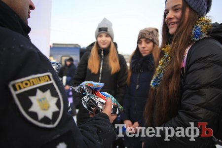 За колядки копы раздавали кременчужанам сладкие подарки и сувениры с символикой.