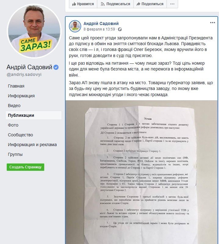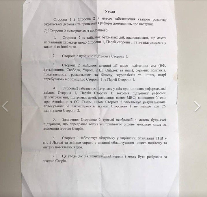– В ефірі політичного ток-шоу “Право на владу” ви сказали, що під час сміттєвого скандалу мали зустріч з Порошенком і він пропонував вам допомогу у вирішенні сміттєвої проблеми в обмін на покірність “Самопомочі” у парламенті. Ви також виклали на своїй сторінці у Фейсбуці текст запропонованої вам в Адміністрації президента угоди. Це не фейк? Його можна сприймати як документ?