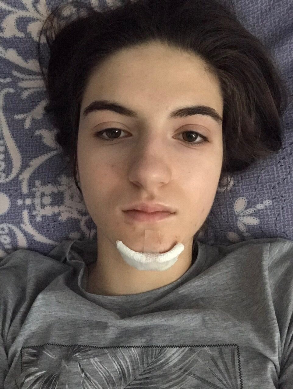 Аня была в тяжелом состоянии, у неё начался отек нёба, две недели мама металась по врачам и кормила дочь через шприц, потому что рот у девочки не открывался. Два передних зуба и одна «двойка» разбиты, один из передних зубов спасти не удалось, там придется ставить имплант.