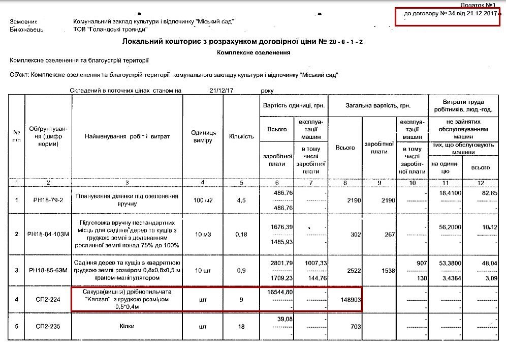 Натомість за рахунок закупівель, близьких до порогів, парк озеленювали навіть взимку. Так, 21 грудня 2017 року керівник «Міського саду» Віталій Дедюрін уклав договір з ТОВ «Голландські троянди» терміном дії до 31 грудня. Саджали японські вишні – сакури. Принаймні так сказано в додатках до договору (хоча взимку саджають хіба що ялини з грудкою землі, а для теплолюбних сакур рекомендований квітень-травень).
