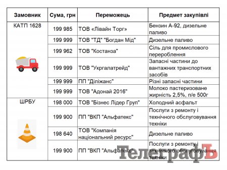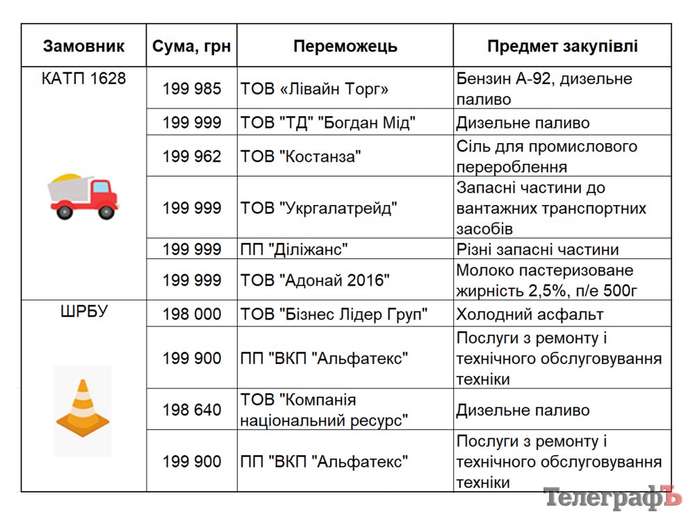 Яскравий приклад уникнення торгів – закупівля КП «Теплоенерго» на суму 999 999 гривень на «Розробку схеми оптимізації роботи централізованої системи теплопостачання», тобто у сумі укладеної угоди не вистачило усього 1 грн, щоб в обов’язковому порядку проводити торги. Приклади «мінус 1 грн» - тобто явного уникнення тендеру – маємо і з КАТП 1628: підприємство у такий спосіб в 2018 році купувало товари чотири рази на суму 199 999 грн: і паливо, і запчастини, і молоко.