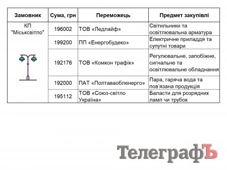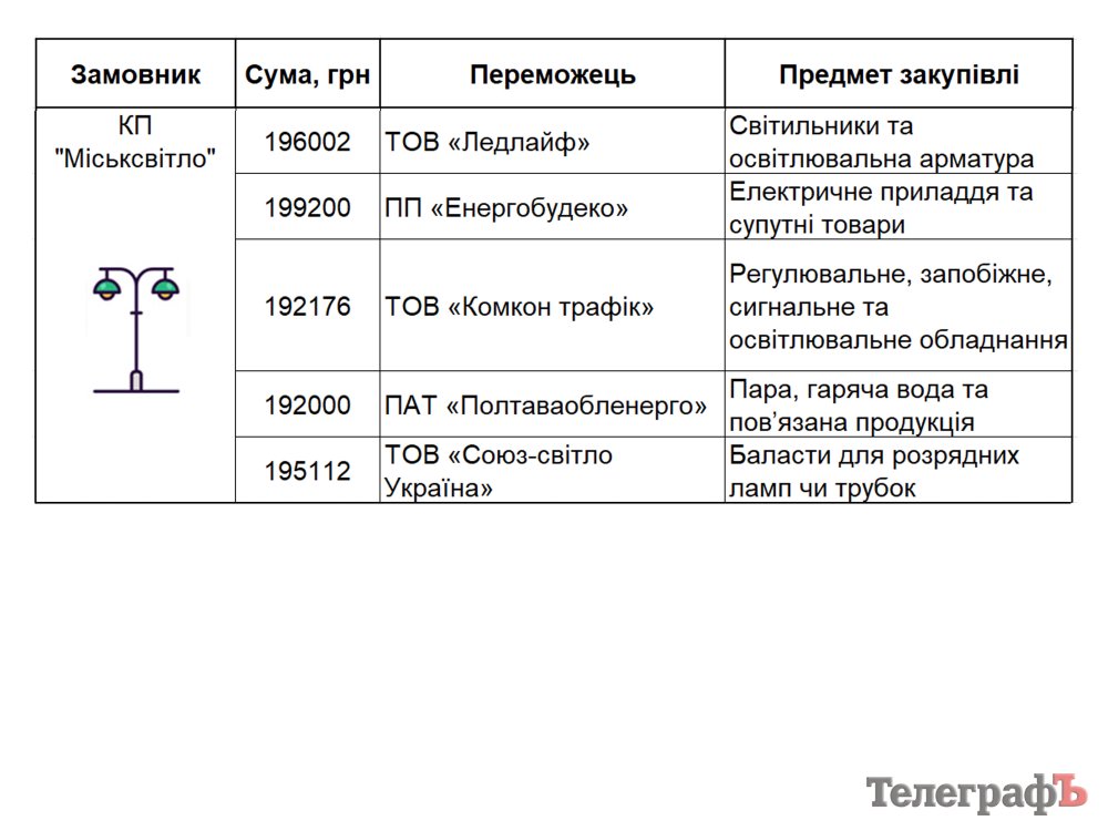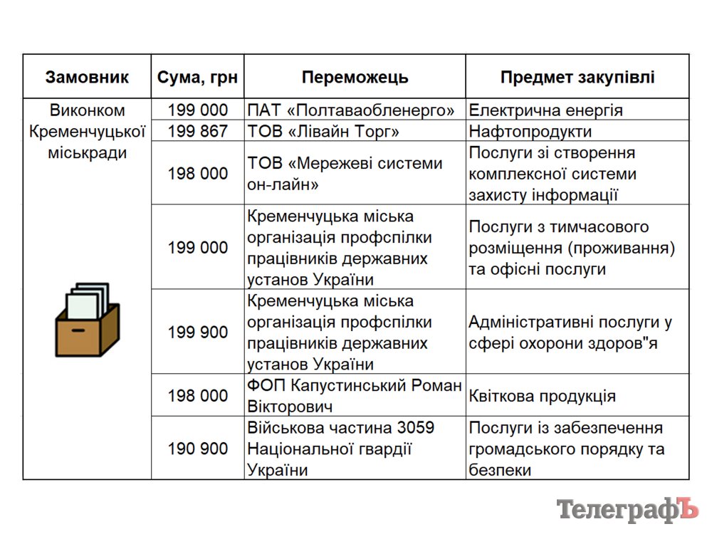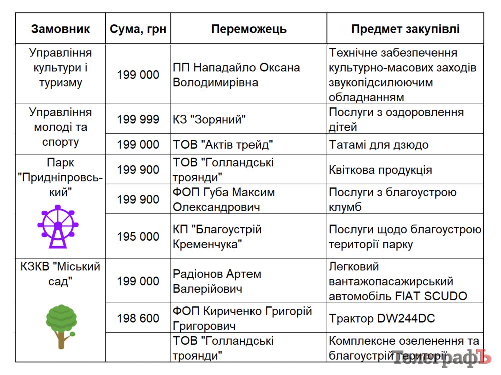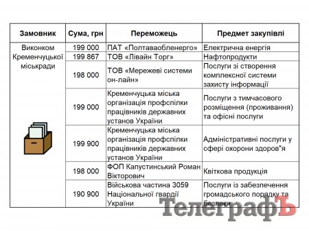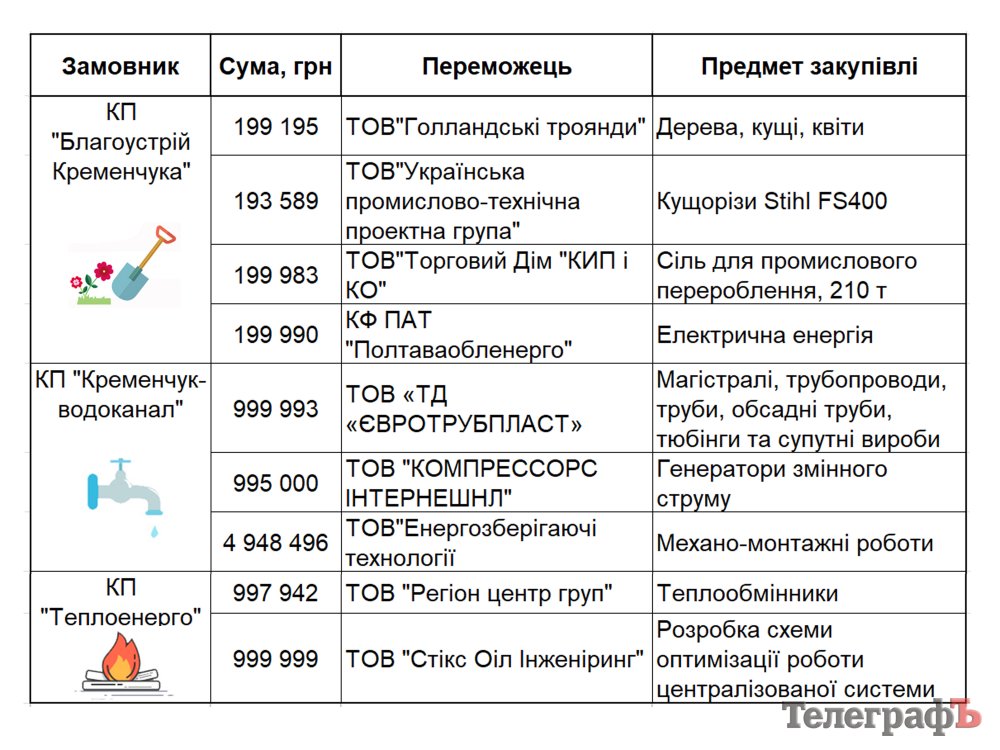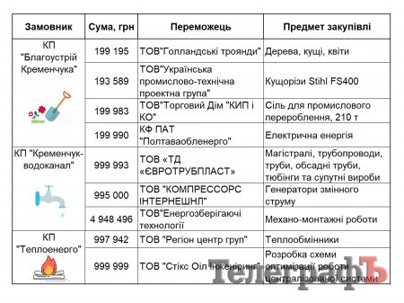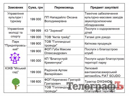 Крім цього, по дві такі закупівлі провели управління молоді та спорту виконкому Кременчуцької міської ради, КП «Теплоенерго», КЗКВ «Міський сад»; одну закупівлю - управління культури і туризму виконкому Кременчуцької міської ради.