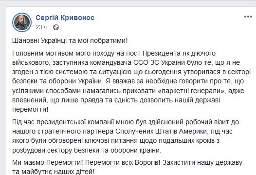 После этой встречи Кривонос подал в Центральную избирательную комиссию заявление об отказе баллотироваться в президенты. Также он сделал заявление о поддержке на выборах президента Порошенко.