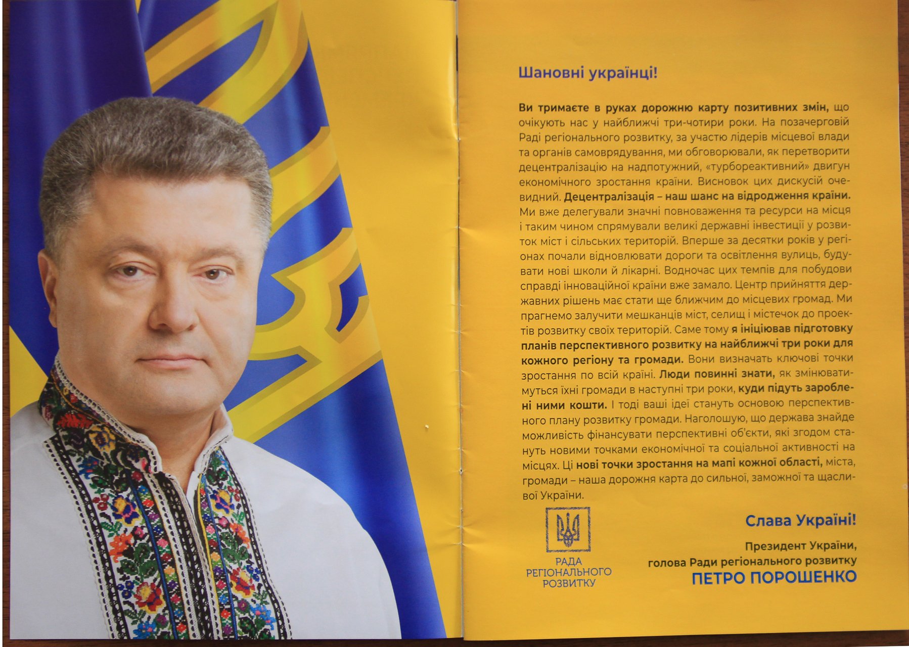 Давайте подводить итоги. В период избирательной компании мы имеем массовую рассылку по Украине полиграфических материалов с портретами президента Порошенко. В материалах рассылки указано, что она подготовлена на выполнение президентского Указа № 412/2018. Это указ «Про додаткові заходи щодо забезпечення реформ із децентралізації влади». Там действительно рекомендовано органам местного самоуправления подготовить планы перспективного развития: