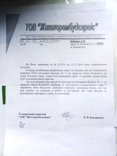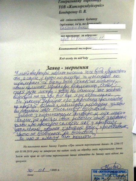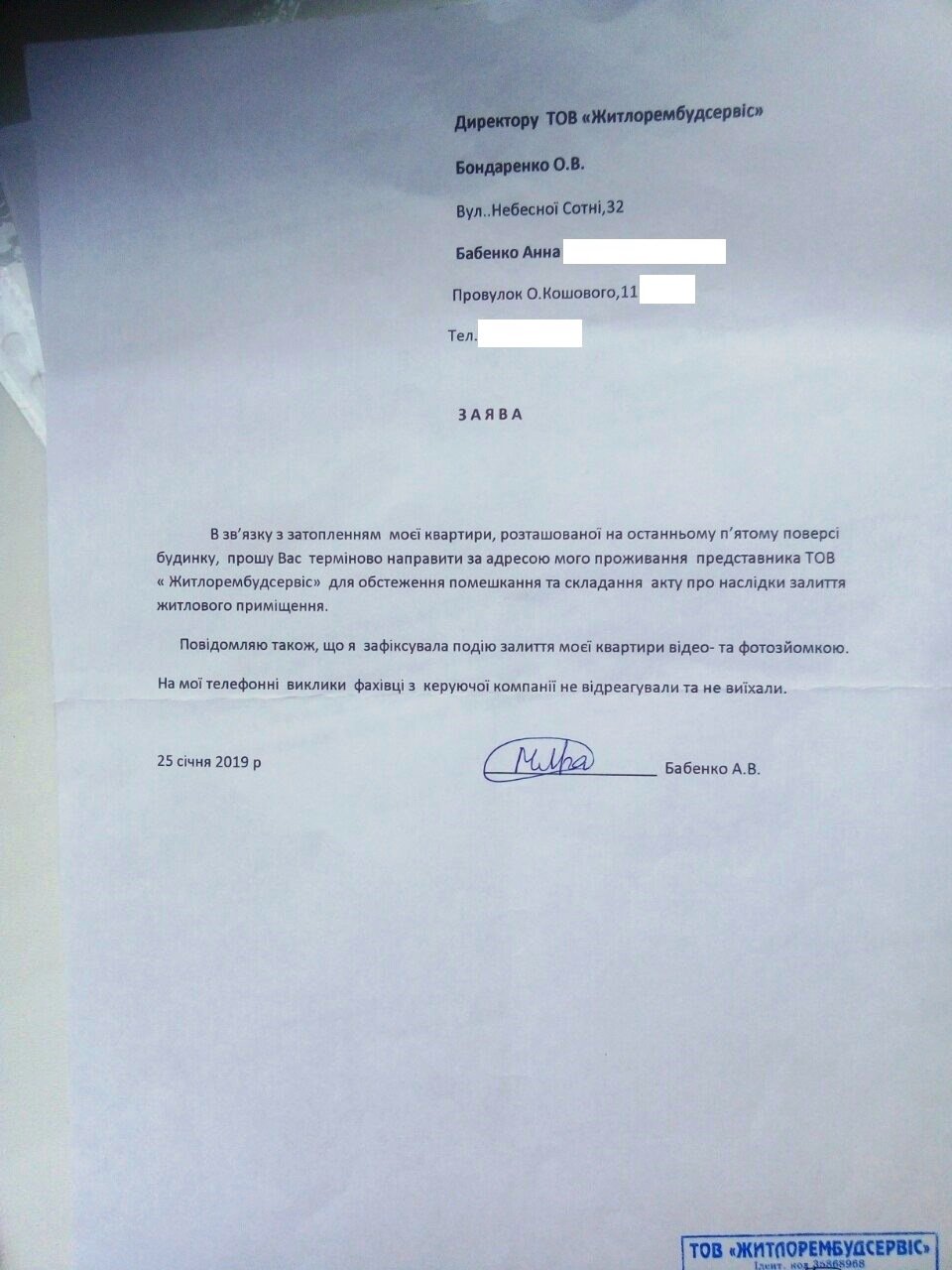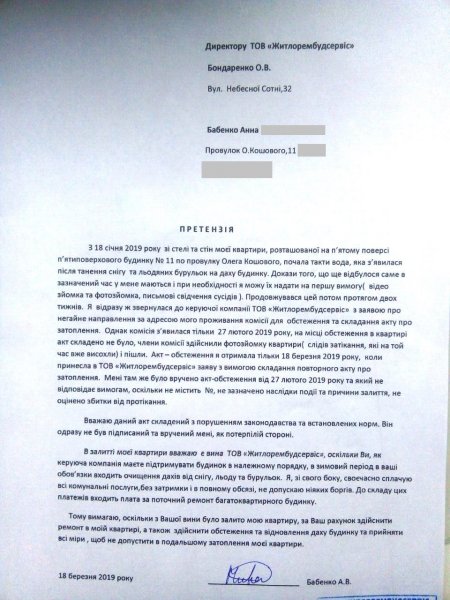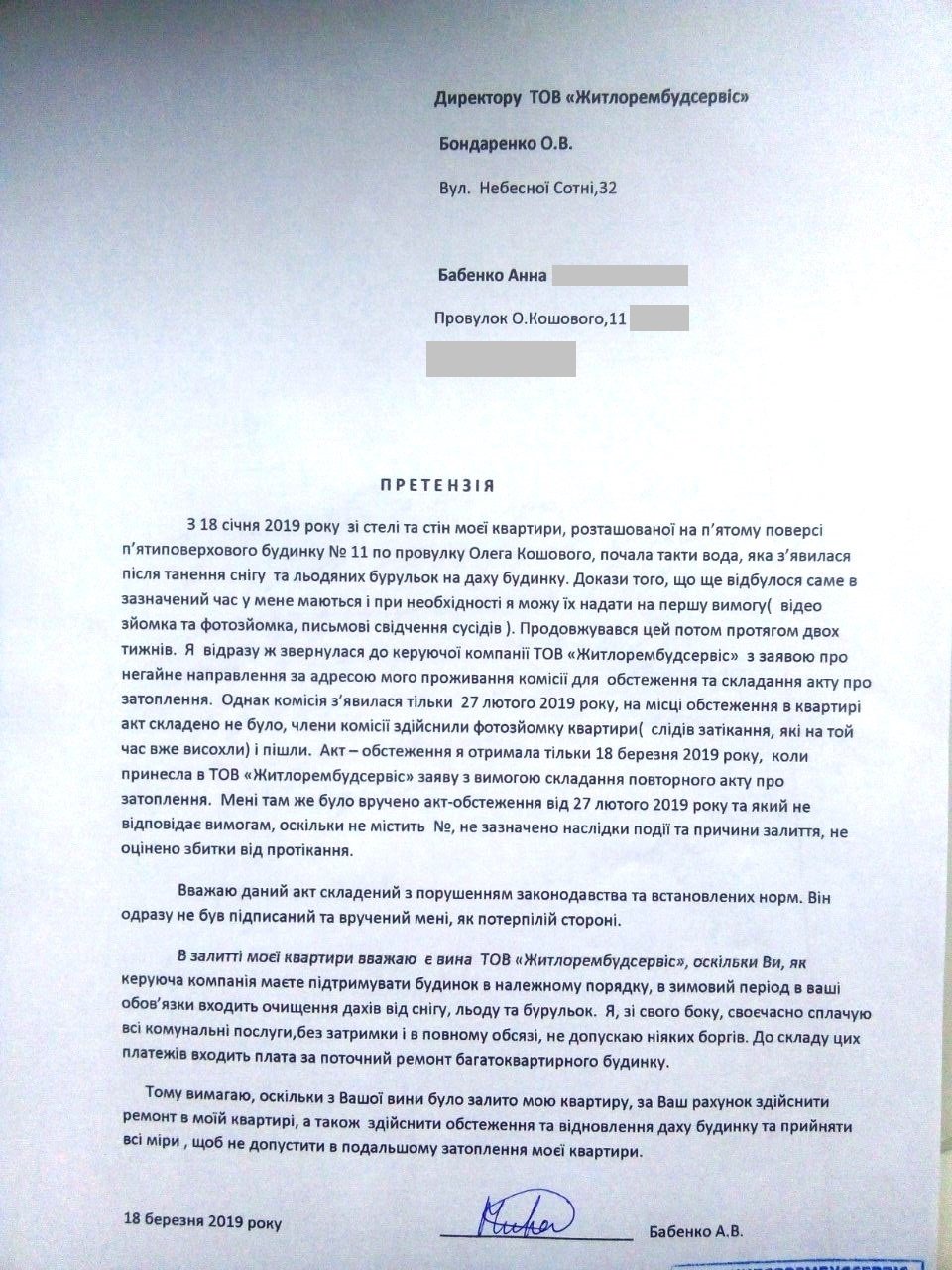 Наприкінці січня Анна написала кілька заяв «Житлорембудсервісу». Скарги були і щодо розчищення снігу з даху, і збивання бурульок. У двох заявах, які Анна надала для публікації, кременчужанка просила скласти представниками «Житлорембудсервісу» акт-обстеження.