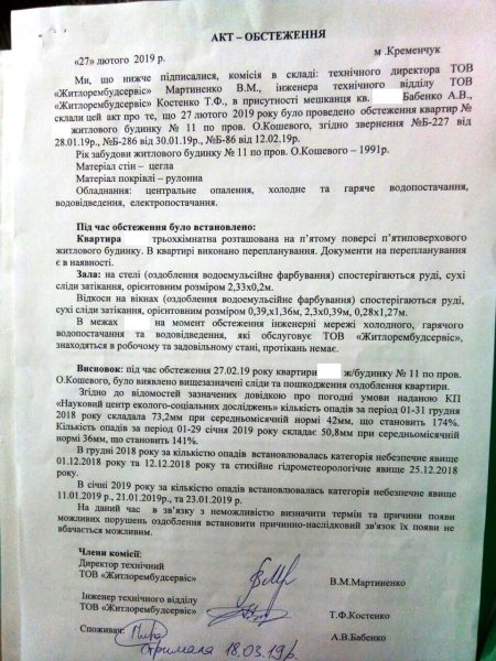 Згідно з копією документа, який також надала Анна, акт-обстеження склали через місяць після першого звернення, а саме 27 лютого. Дівчина розповіла, що до того часу стіна підсохла.