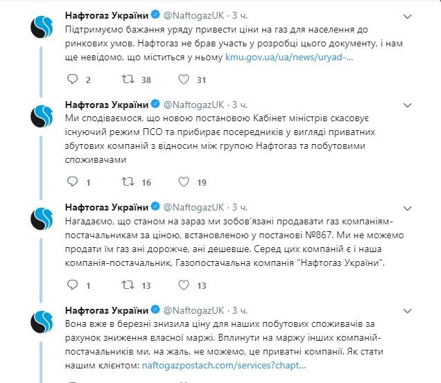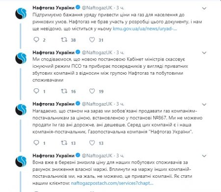 Нагадаємо, що станом на зараз ми зобов‘язані продавати газ компаніям-постачальникам за ціною, встановленою у постанові №867. Ми не можемо продати їм газ ані дорожче, ані дешевше. Серед цих компаній є і наша компанія-постачальник, Газопостачальна компанія «Нафтогаз України», - це з листування «Нафтогаз України» у Твіттері.
